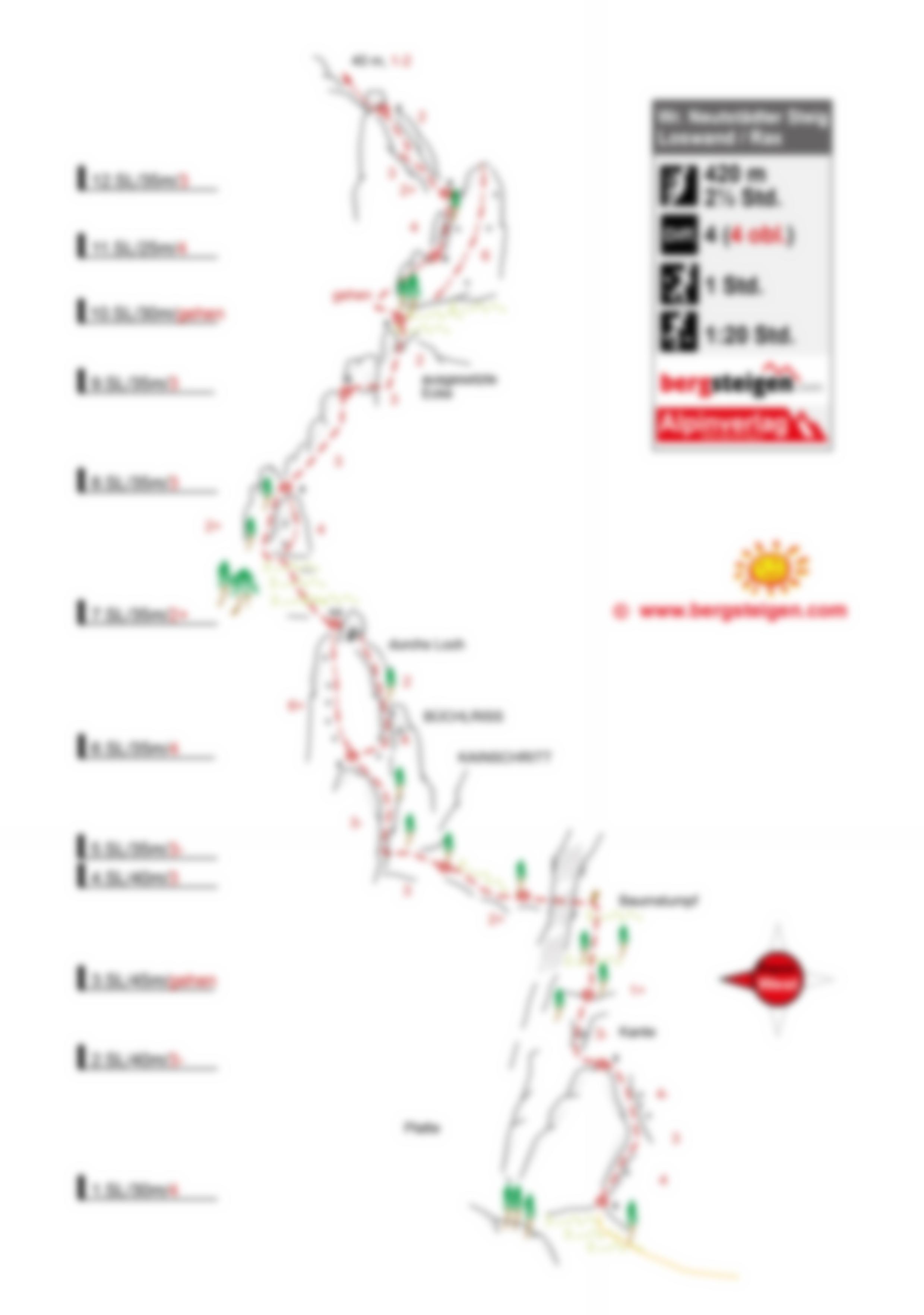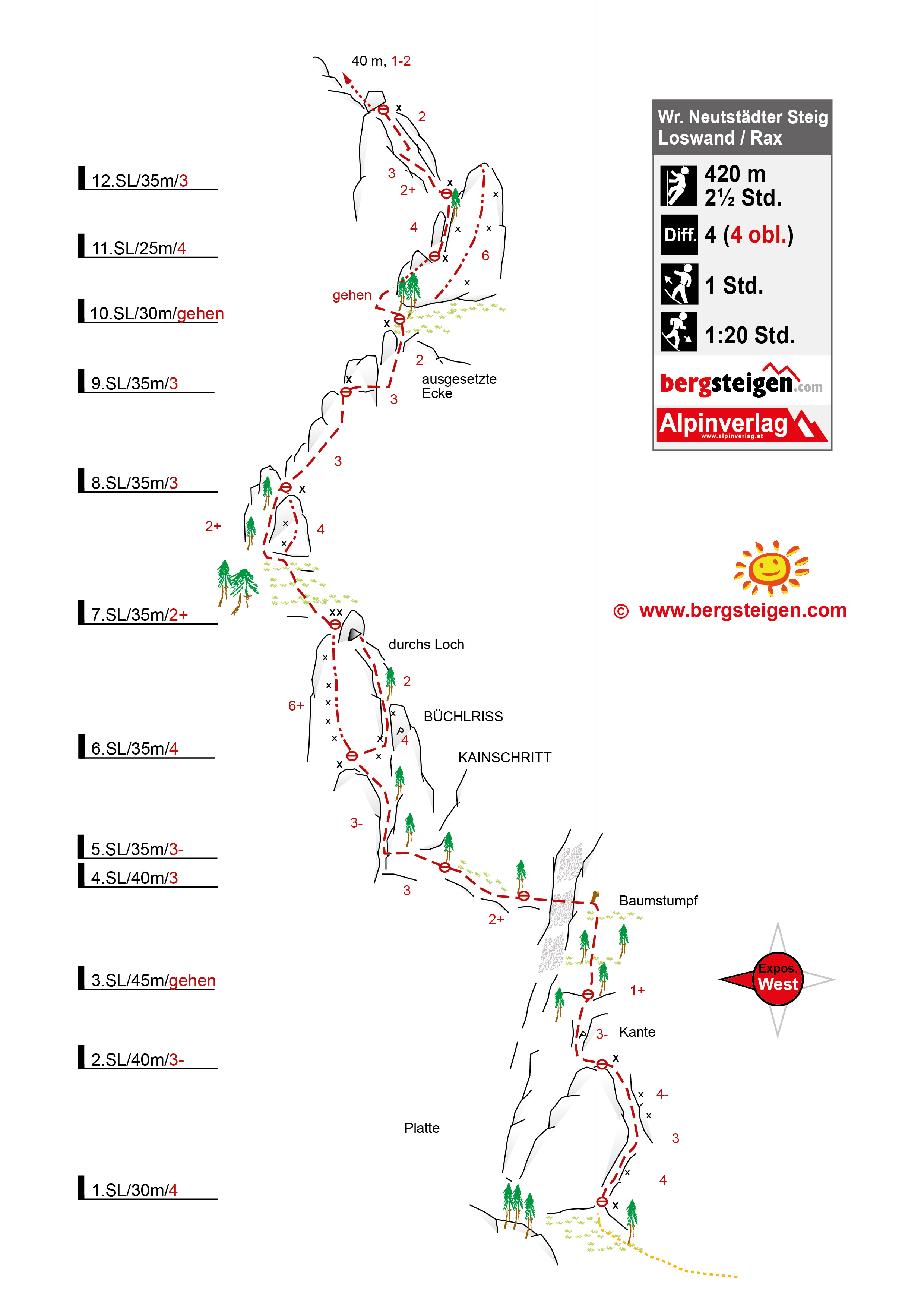 Interessanter alpiner Anstieg in der Hinteren Loswand. Schöne Kletterstellen wechseln mit brüchigen Raxschrofen und Gehgelände. Orientierung dank der blauen Striche gut möglich. Tour wurde von Martin Simek mit Bohrhaken an den Ständen und vereinzelt als Zwischensicherung saniert und mit 3 Varianten versehen. Alpiner Anstieg, nichts für Plaisirkletterer.
