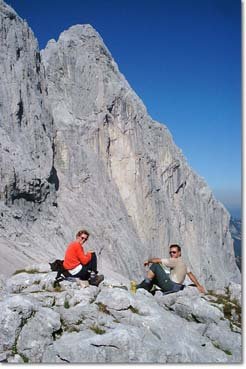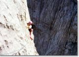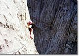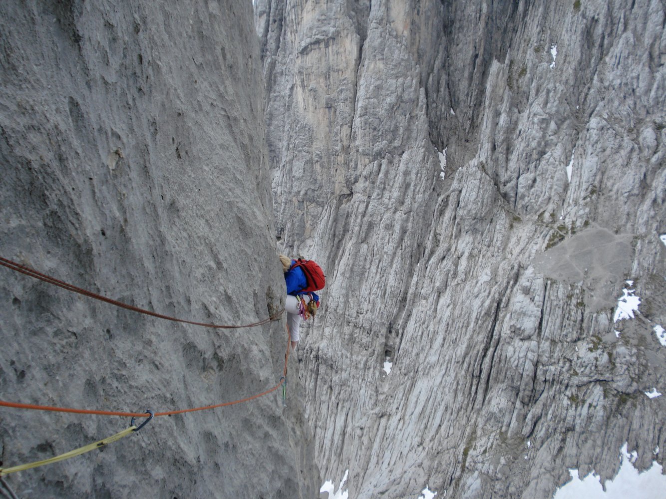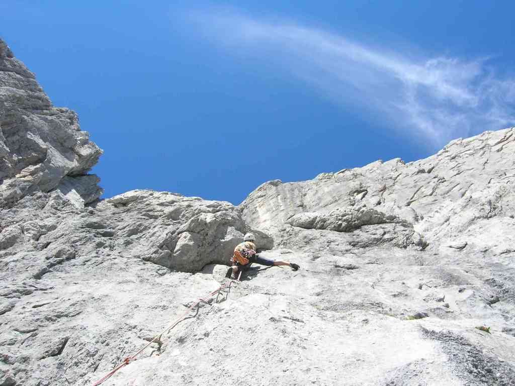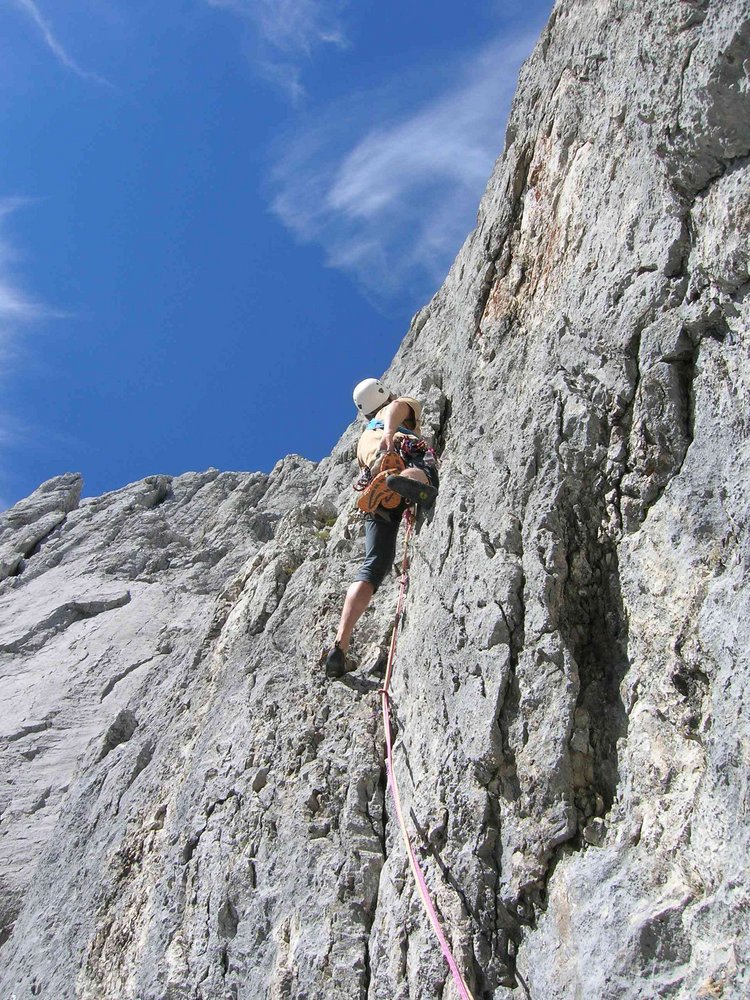 Ein alpiner Klassiker im Kaisergebirge der sich grosser Beliebtheit erfreut. Die Route verlaeuft ueber schoene Platten; nach einem Grasband ueber das 17 m Wandel in 11 Seillaengen zum Gipfel der Fleischbank 2187 m. Die Kletterei ist vorwiegend im 5ten und 6ten Grad, wobei sich die Schwierigkeit bei Hakenbenuetzung auf 5+/A0 reduziert. Im unteren Teil befindet sich ein Seilquergang, der aber unterhalb umgangen werden kann (schoene Kletterei!) Die Kletterei ist aufgrund der SO-Lage schon frueh im Jahr moeglich und auch im Herbst bei schoenem Wetter zu empfehlen. Durch die eingebohrten Standhaken ist diese Route wieder etwas sicherer geworden.