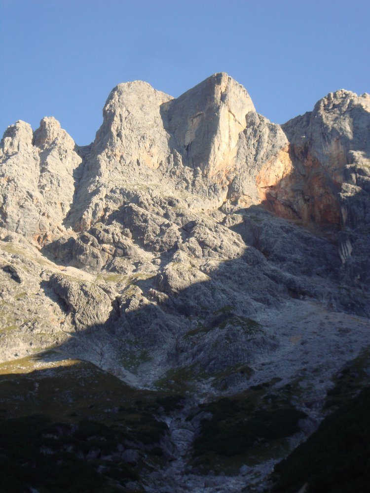Der Abstieg erfolgt über den markierten Steig über die Torscharte (3-4 Std.) oder über 3x60m Abseilen zum Wandfuß. (Reepschnur mit Ring am Ausstieg und jeweils 2 Normalhaken an Stand 2 und Nähe Stand 3). Es wird keine Haftung für die Abseilstände übernommen!