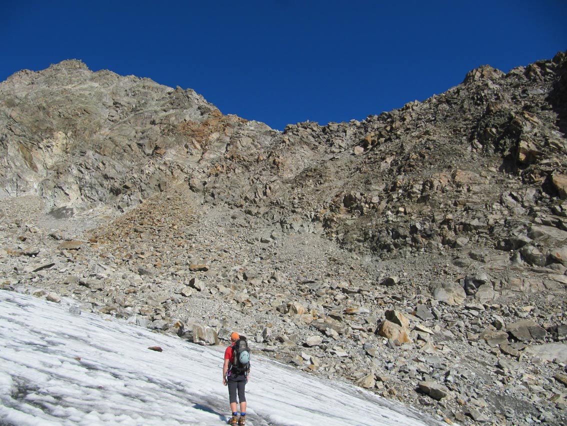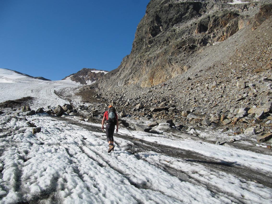 Man kann den Zu- und Abstieg ohne Gletscherberührung im Schutt gehen, ist aber tlw. mühsamer als mit den Steigeisen auf dem Eis.
