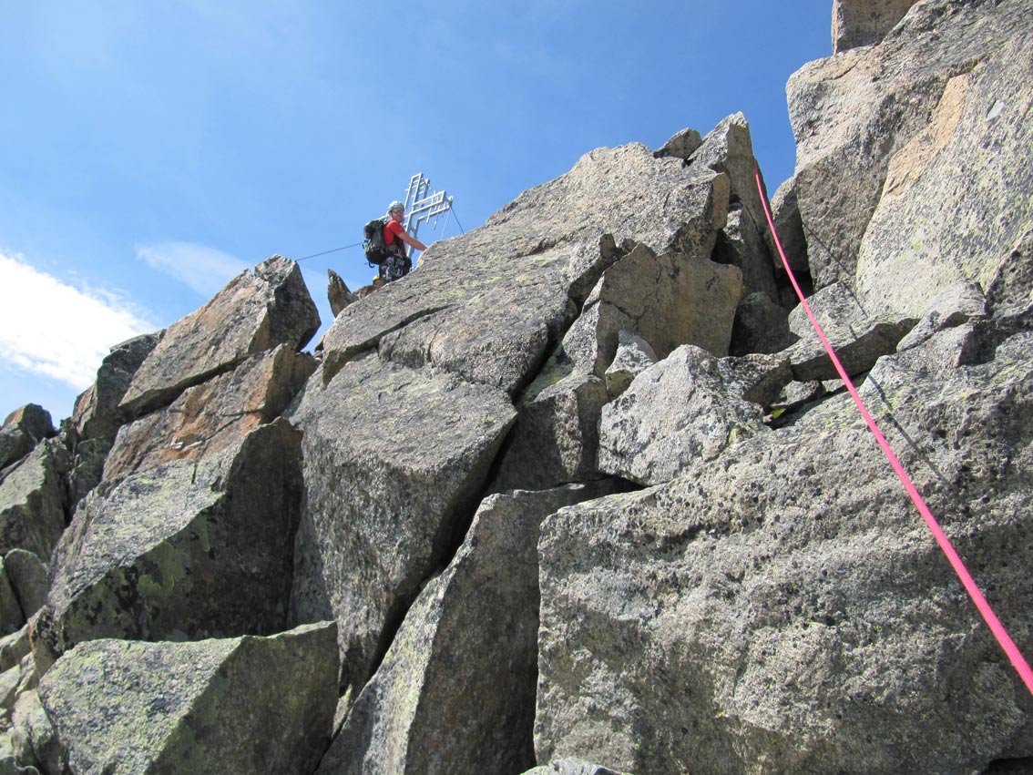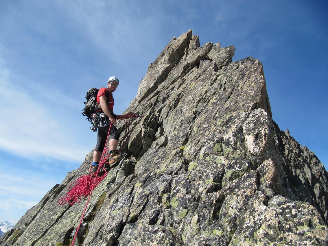 Anspruchsvolle alpine Klettertour, sowohl der Ostgrat als auch der Abstieg auf dem Südwestgrat. Seit 2015 seilt man NICHT mehr an der Südwand ab, da ein Felssturz den Abstiegsweg stark verändert hat. Man steigt aktuell auf dem Südwestgrat ab (steile Passagen sind mit Bohrhaken zum Abseilen eingerichtet, der Abstieg ist markiert).
