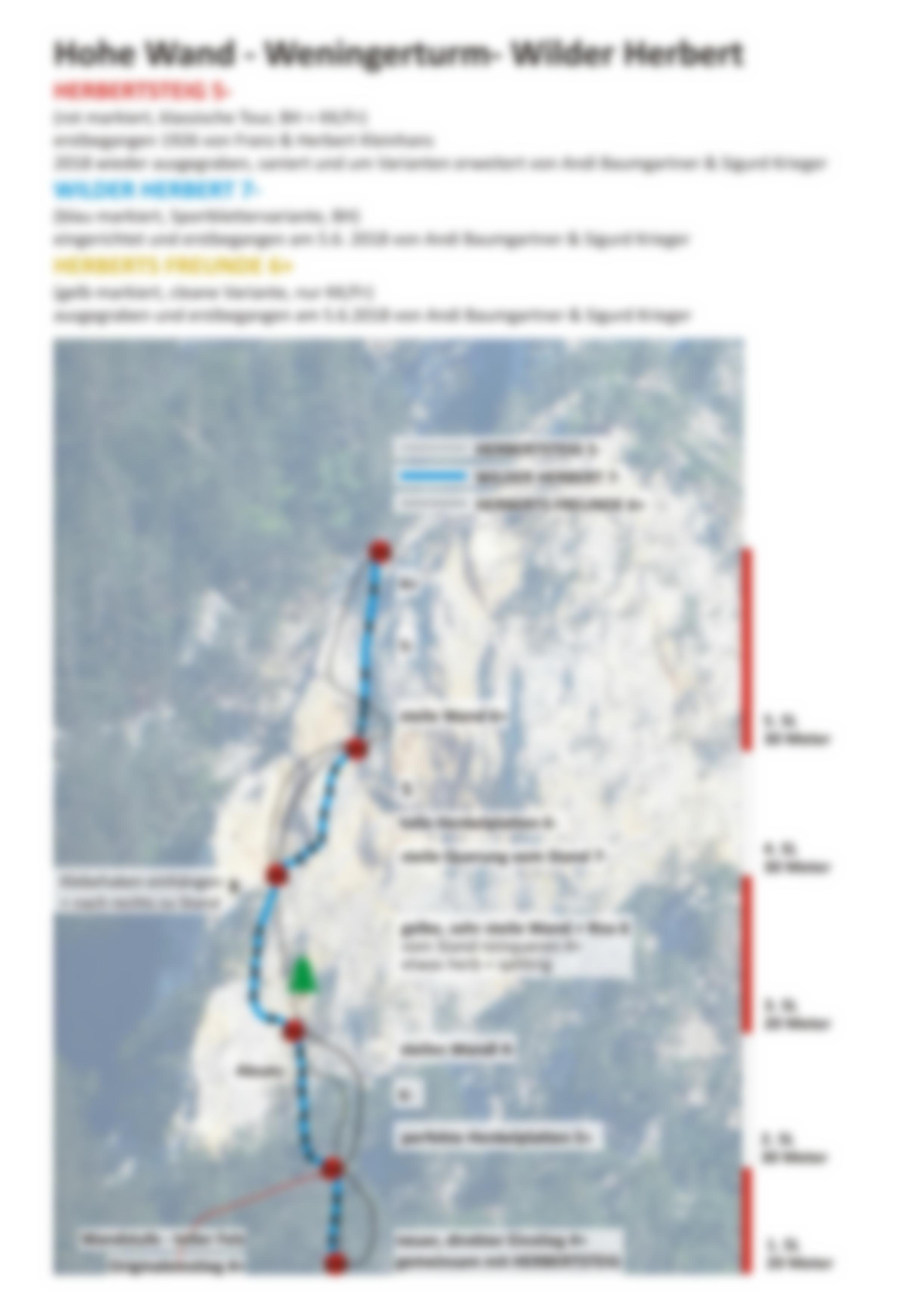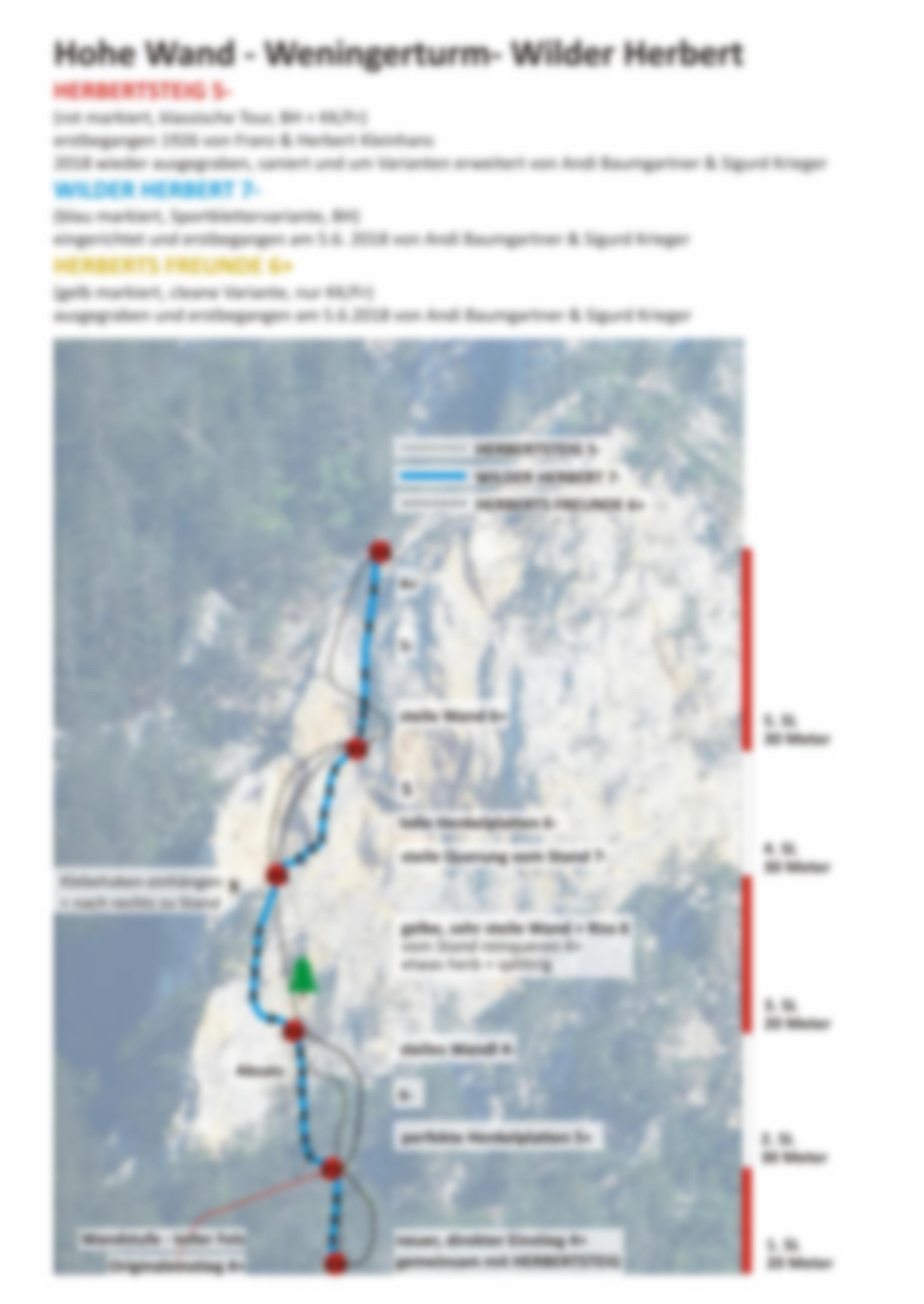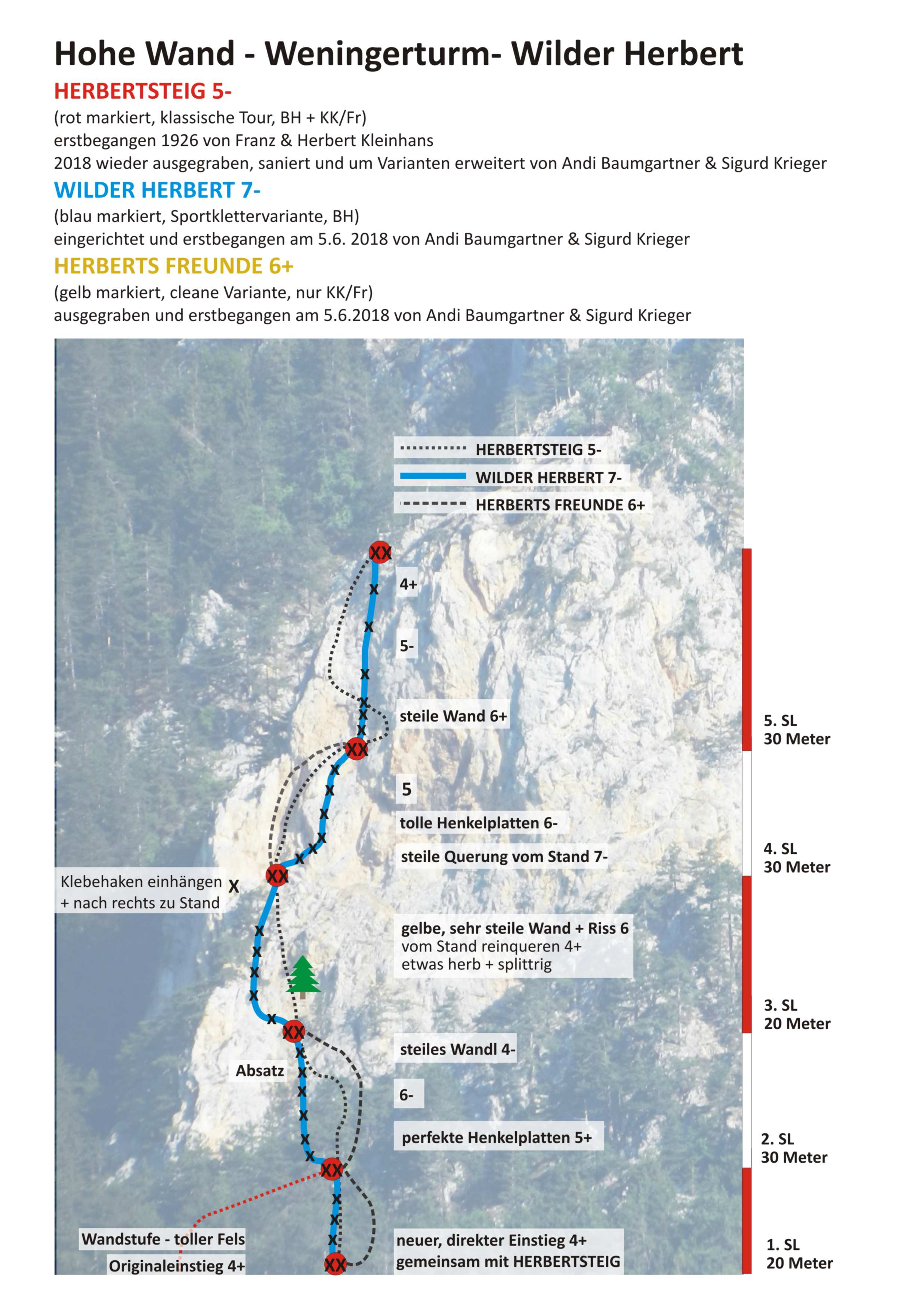 Der klassische Herbertsteig wurde 1926 von Franz und Herbert Kleinhans erstbegangen, in den letzten Jahren aber kaum mehr geklettert. Dementsprechend verwachsen und auch stellenweise brüchig war die Tour. 2017/18 wurde die Route von Andi Baumgartner und Sigurd Krieger ausgiebig geputzt und saniert. Im Zuge dieser Routensanierung wurde die Tour "Wilder Herbert" als neue Sportklettertour mit eigenständiger Linie (7-) eingerichtet, die sich nur die 1. SL und die Standplätze mit dem Herbertsteig teilt. Die Route führt entweder über tolle und kompakte Henkelplatten (SL 2 und 4), über eine dolomitensteile Wand in der 5. SL und über einen wilden und steilen Riss in der 3. SL.