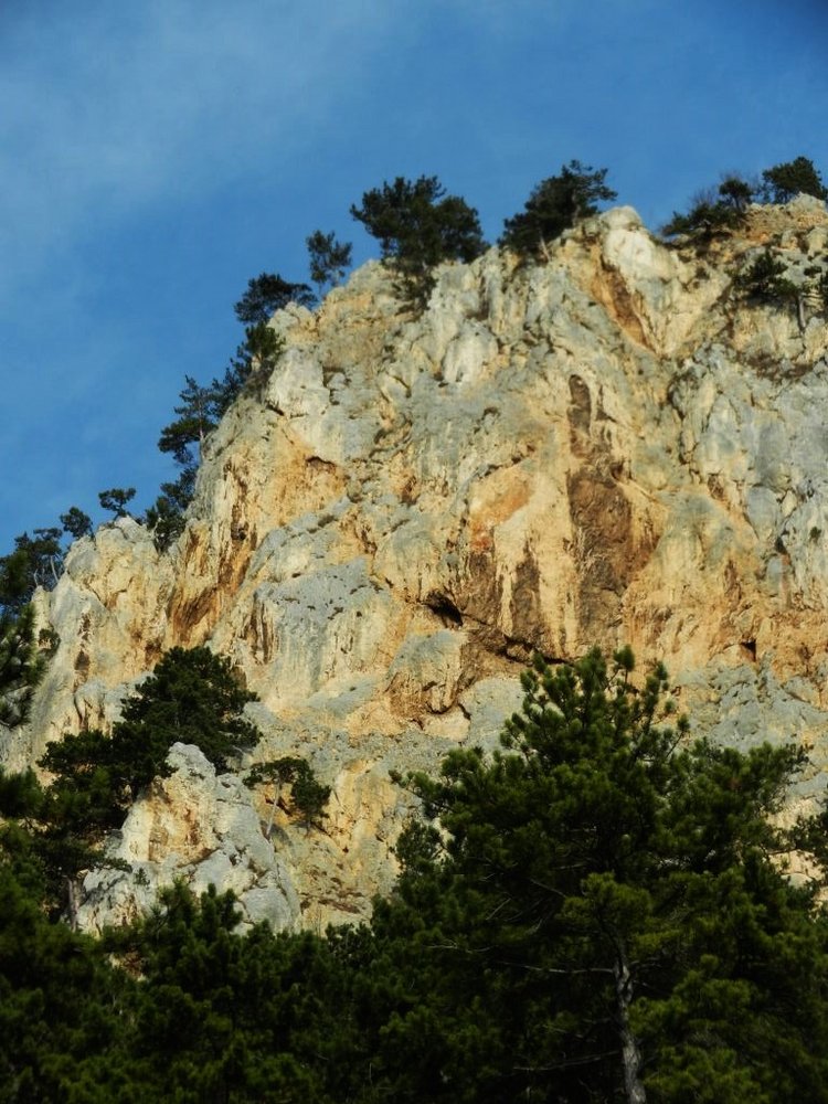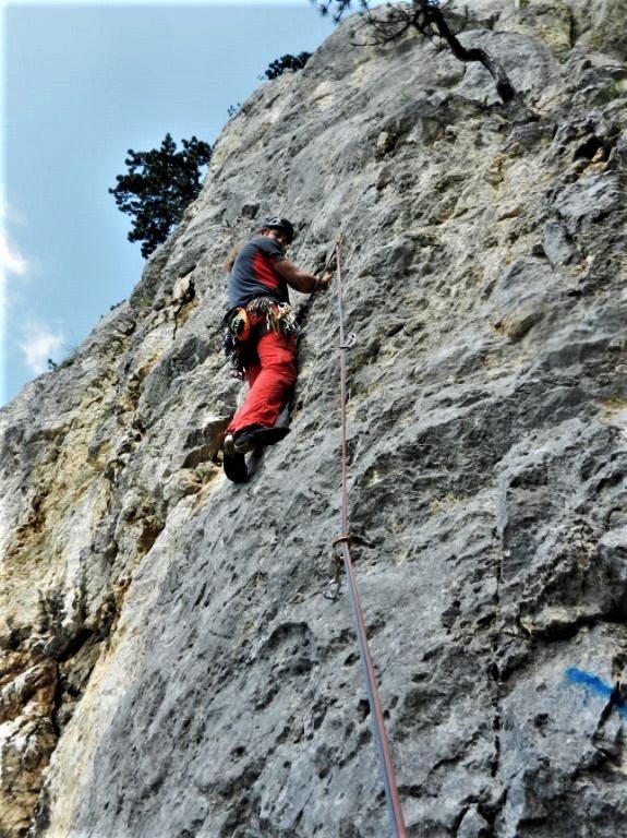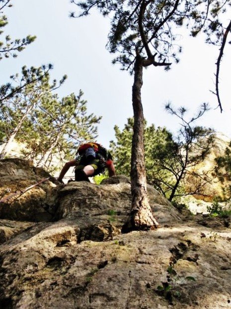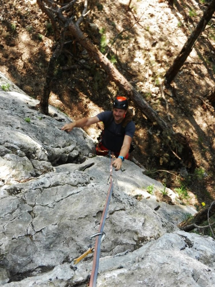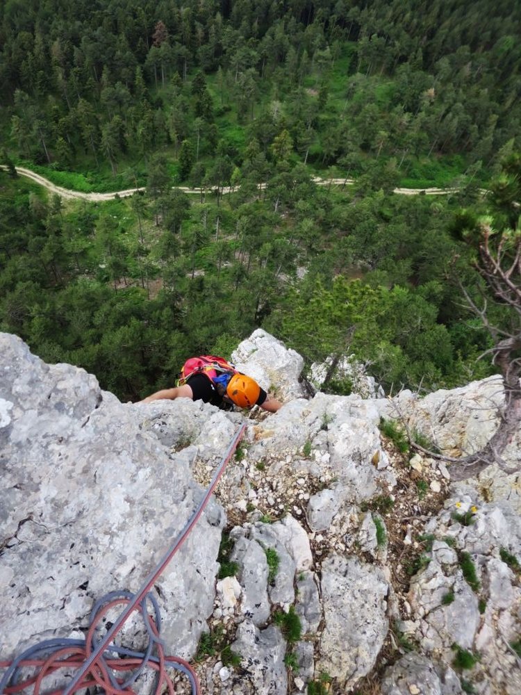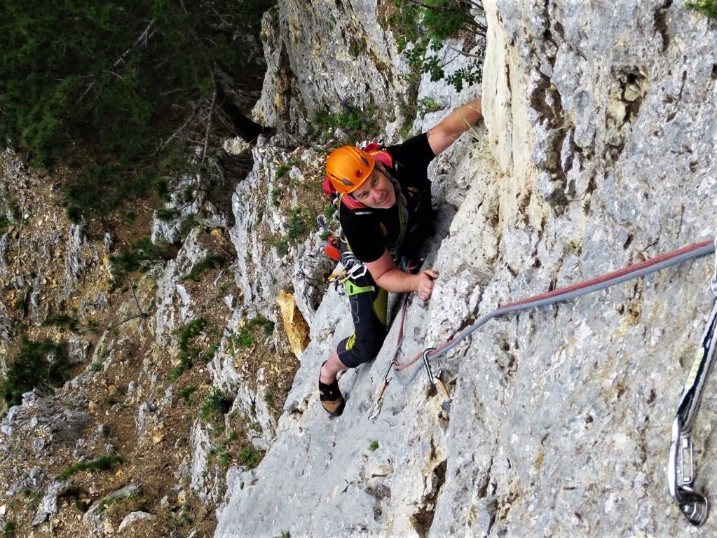 komplette Kletterausrüstung und Helm (!), vom benachbarten Gebirgsvereinsklettersteig werden immer wieder Steine losgetreten.
