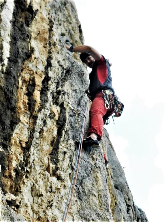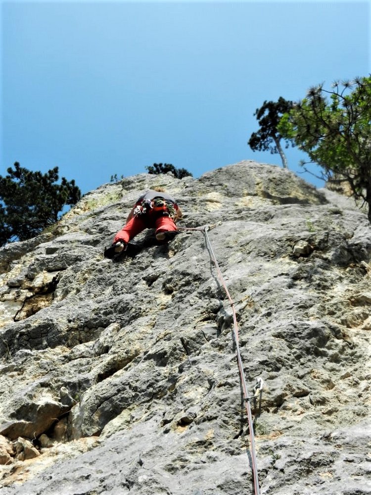 Die Route ist an allen Ständen mit 2 BH und mit ausreichend Zwischen-BH gesichert. Klemmgeräte sind nicht nötig, können aber eingesetzt werden. Die erste Schlüsselstelle in der 4. SL (7- steile Querung um eine Kante) ist bewusst so eng gesichert, dass auch ambitionierte 6er-Kletterer die Tour gut klettern können. Die zweite Crux in der 5. SL (vom Standplatz gerade hinauf über graue Platten) ist etwas leichter, wenn man sich eher rechts hält, direkt an den BH ist sie recht hart zu klettern.
