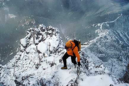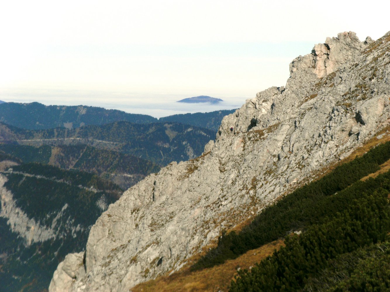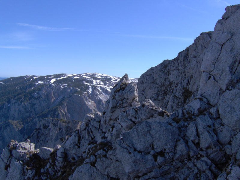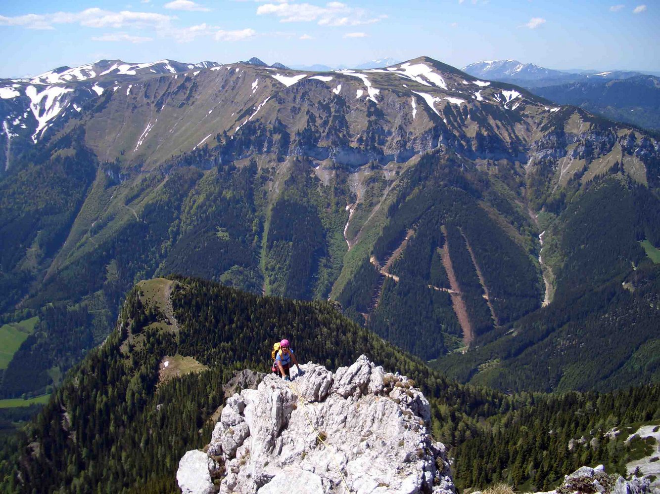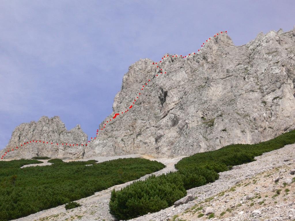 Dieser Gratanstieg ist eine der schönsten Möglichkeiten, um kletternd auf die Heukuppe zu gelangen. In ruhiger und zu unrecht selten besuchter Landschaft, ist das Klettererlebnis fast doppelt so schön. Die Route verläuft meist im Bereich des Grates und hat nur 3 Stellen die den ersten Schwierigkeitsgrad überschreiten. Der Anstieg ist durchgehend rot markiert und hat nach der Schlüsselstelle sogar einen Klebebohrhaken. Im Winter (wie auf den Fotos zu sehen) stellt die Route ein ernstzunehmendes, alpines Unternehmen dar und sollte nur von Leuten gemacht werden, die schon Erfahrung mit Winterklettereien haben. (Vorsicht im Winter: Lawinensituation genau berücksichtigen).