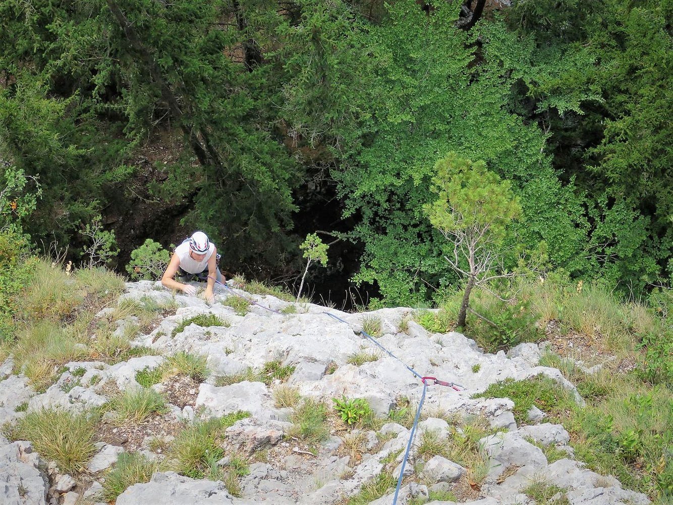 Vom Ausstieg leicht rechts haltend eben im Wald weiter, bis man auf der Hinterseite des Burgstalls (N) steil im Wald auf einem kleinen Steig absteigen kann - man kann direkt zum Forstweg oder zum Einstieg absteigen. Dann über den Zustiegsweg weiter absteigen.