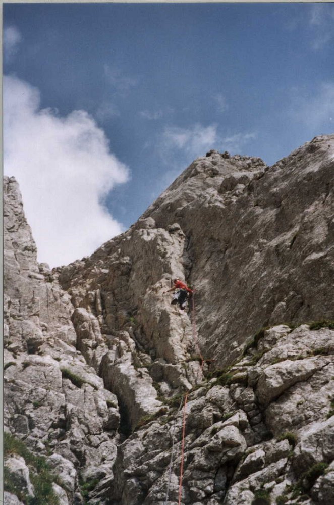 Variante a) Durchs Stangenkar. Von der Scharte rechts aufwärts und eine Rinne queren. Den Steinmännern folgend absteigen. Teilweise I und II. Trittsicherheit erforderlich. ca. 1 Stunde zum Einstieg.
