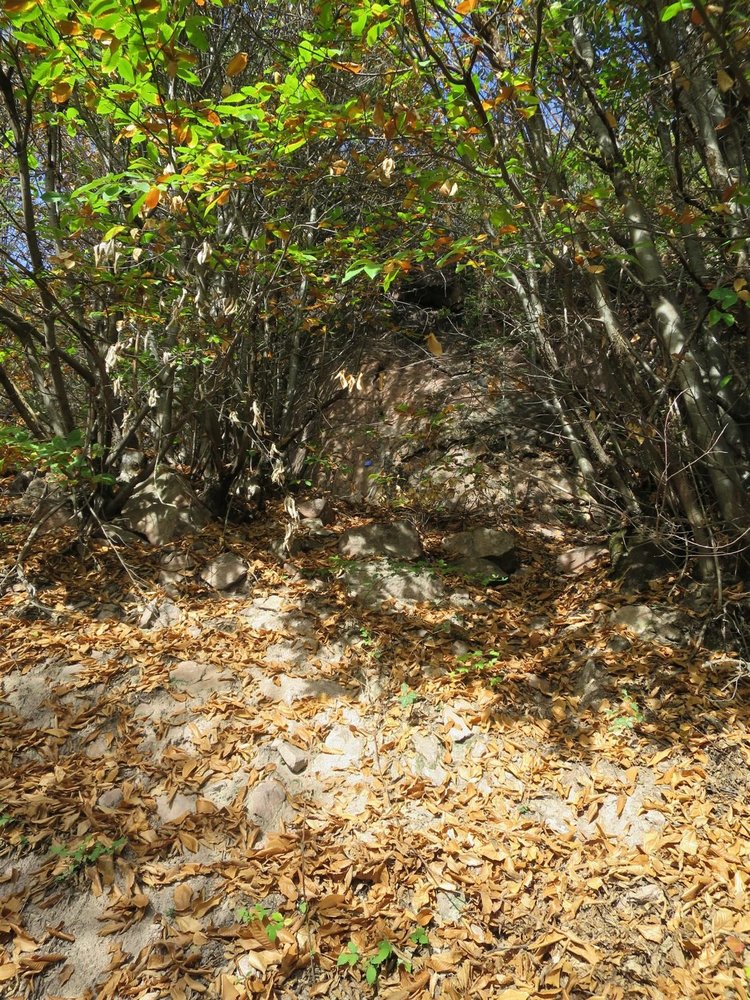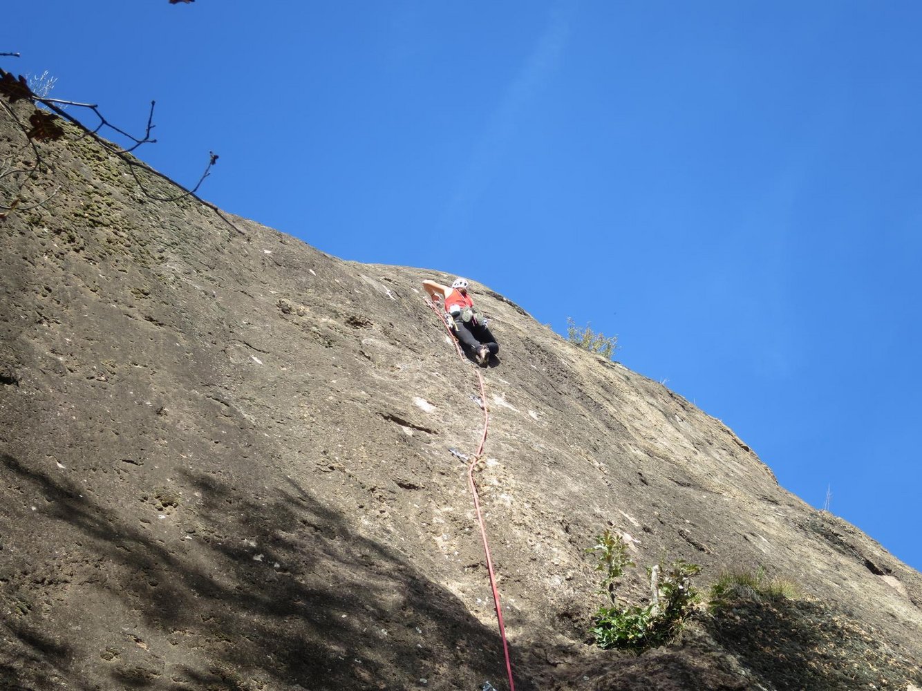 5. [30 m, 6, 4 BH]: Kurze Wandstelle, dann Gehgelände bis zu Blöcken (links ist die Dirty Flirty) und nach den Blöcken noch etwas hinaufgehen und rechts zum Stand. 1 BH.