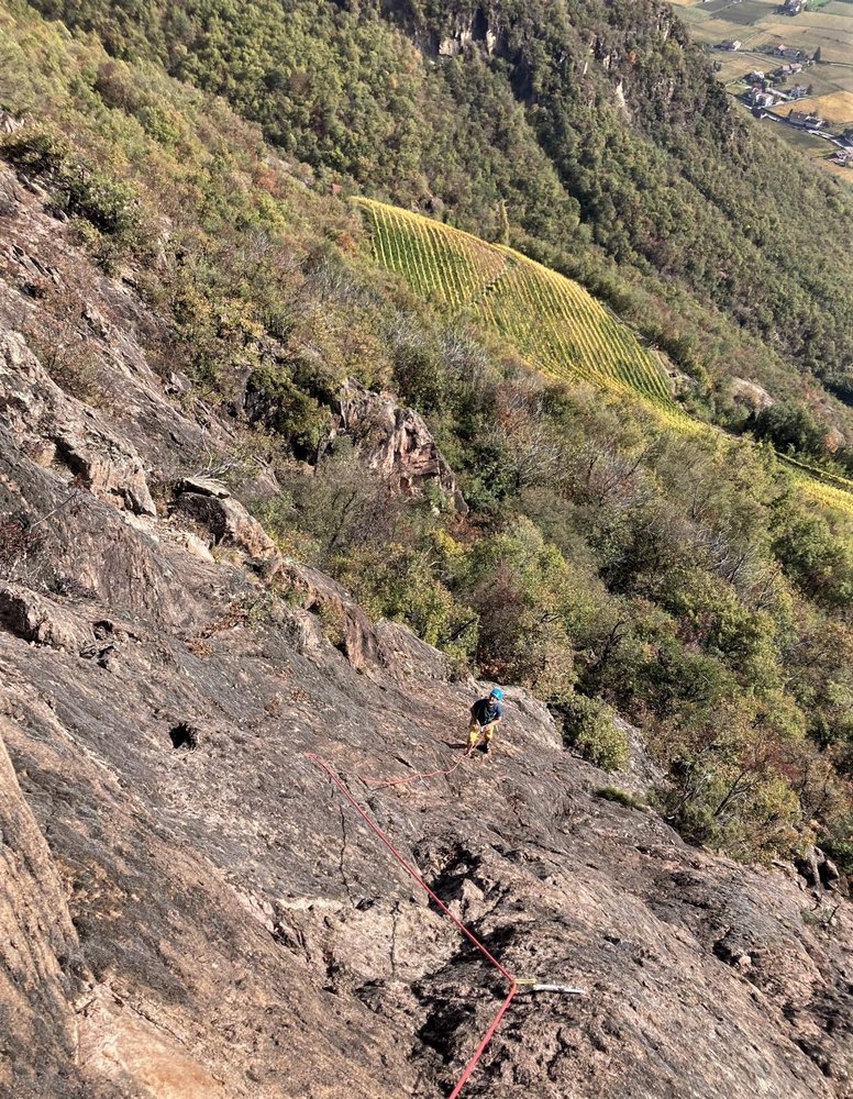 3. [45 m, 4, 9 BH]: Die Platte hinauf, oben rechts halten und beim BH mit langer Schlinge rechts in die Wald queren bis zum Stand an Baum bei einer Verschneidung.