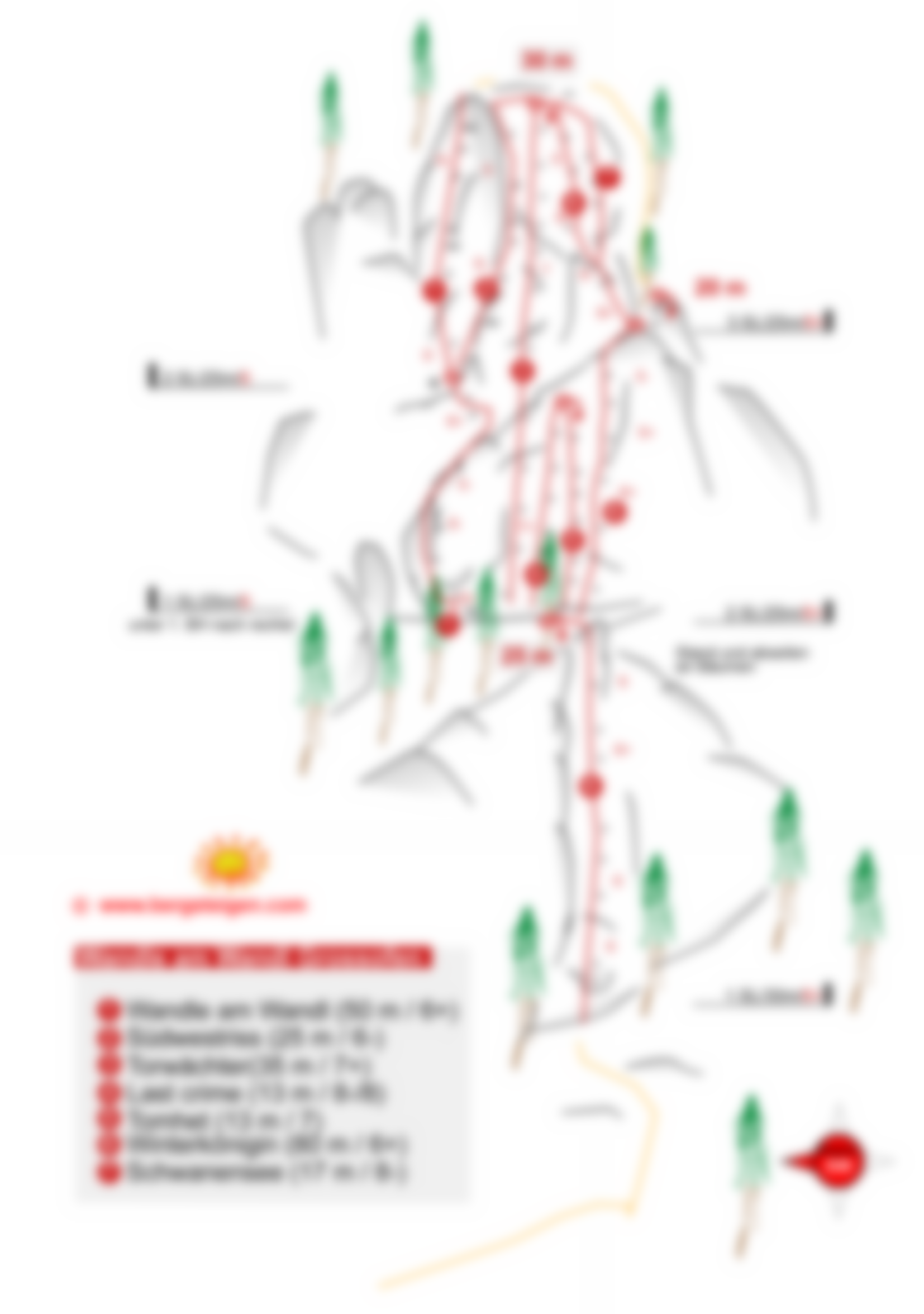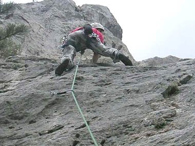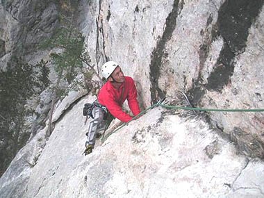 Die erste Länge führt über eine etwas splittrige Platte (aber sehr gut gesichert) auf einen Grasabsatz mit kleinen Bäumen. (Von dort gehen mehrere Touren weg). Die ganz rechte Linie über gut griffige Platten unter einen Überhang nach rechts zum Stand. Die letzte laenge quert scharf nach links (nicht gerade hinauf) und verläuft dann senkrecht nach oben zum Schlußstand.