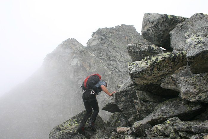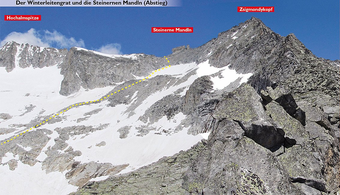 Siehe Topo. Die schweren Passagen sind diverse Wandstellen und kurze Querungen, dazwischen auch immer wieder langes, leichtes Block- oder Gehgelände. Bis zum Turm mit der Abseilstelle sind vereinzelt Bohrhaken vorhanden, danach nicht mehr. Die meisten sperrenden Passagen werden rechts umgangen. Ab dem Zsigmondykopf auf dem NW-Grat zu den Steinernen Mandln, diese Zacken werden rechts auf dem Gletscher umgangen. Nach den Zacken gelangt man wieder auf den Grat, dem man bis zum Gipfel folgt