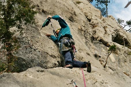 Bei der Route handelt es sich um eine nette Plattentour (Ausnahme 1. SL, rechts ein genialer, aber weiter Sprung von Henkel zu Henkel, links komische Wandstelle) in überwiegend sehr gutem Fels mit vielen Einzelstellen im Grad 7-. Die Absicherung ist gut, aber teilweise etwas weiter mit Bohrhaken und SU. Stand tw. an Bäumen, KK werden nicht benötigt aber dafür mind. zwei Schlingen. Helm unbedingt tragen. Abseilen über die Route möglich. EB tw. von unten (1. SL, 2. SL und 5. SL).