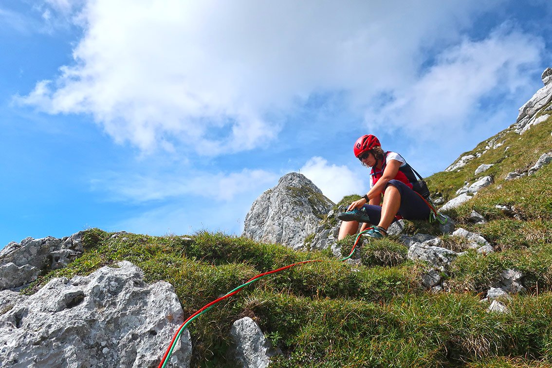 Vom Ende der Route steigt man etwas nach links hinüber und geht dann steil eine Grasmulde zu einem Fixseil hinunter. Entlang des Fixseils zum Beginn der Abseilpiste - man seilt 3 x mit einem Doppelseil ab.