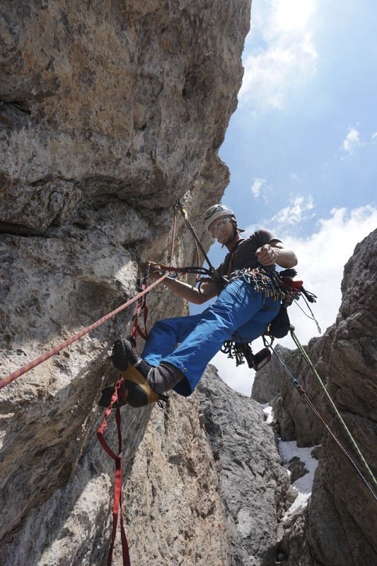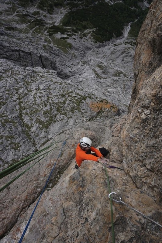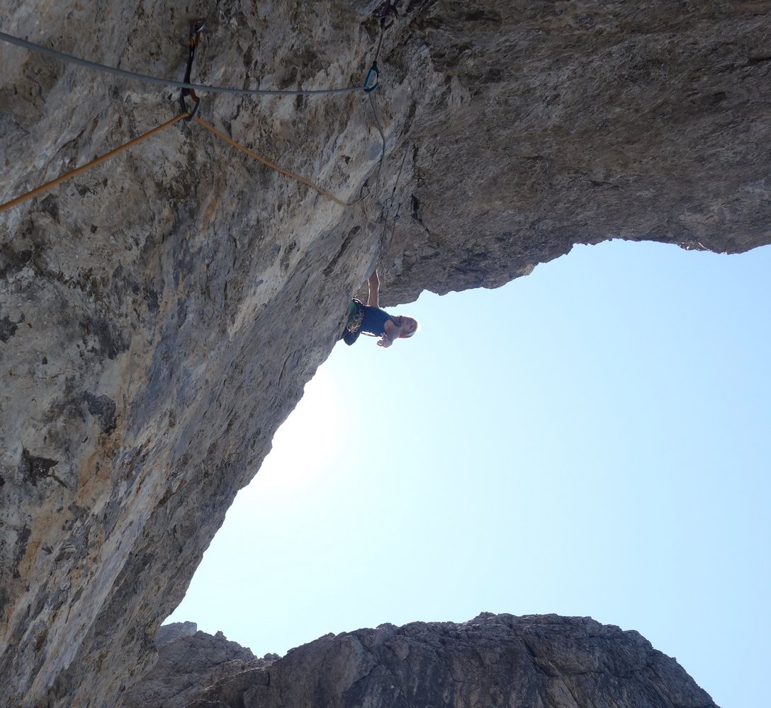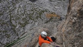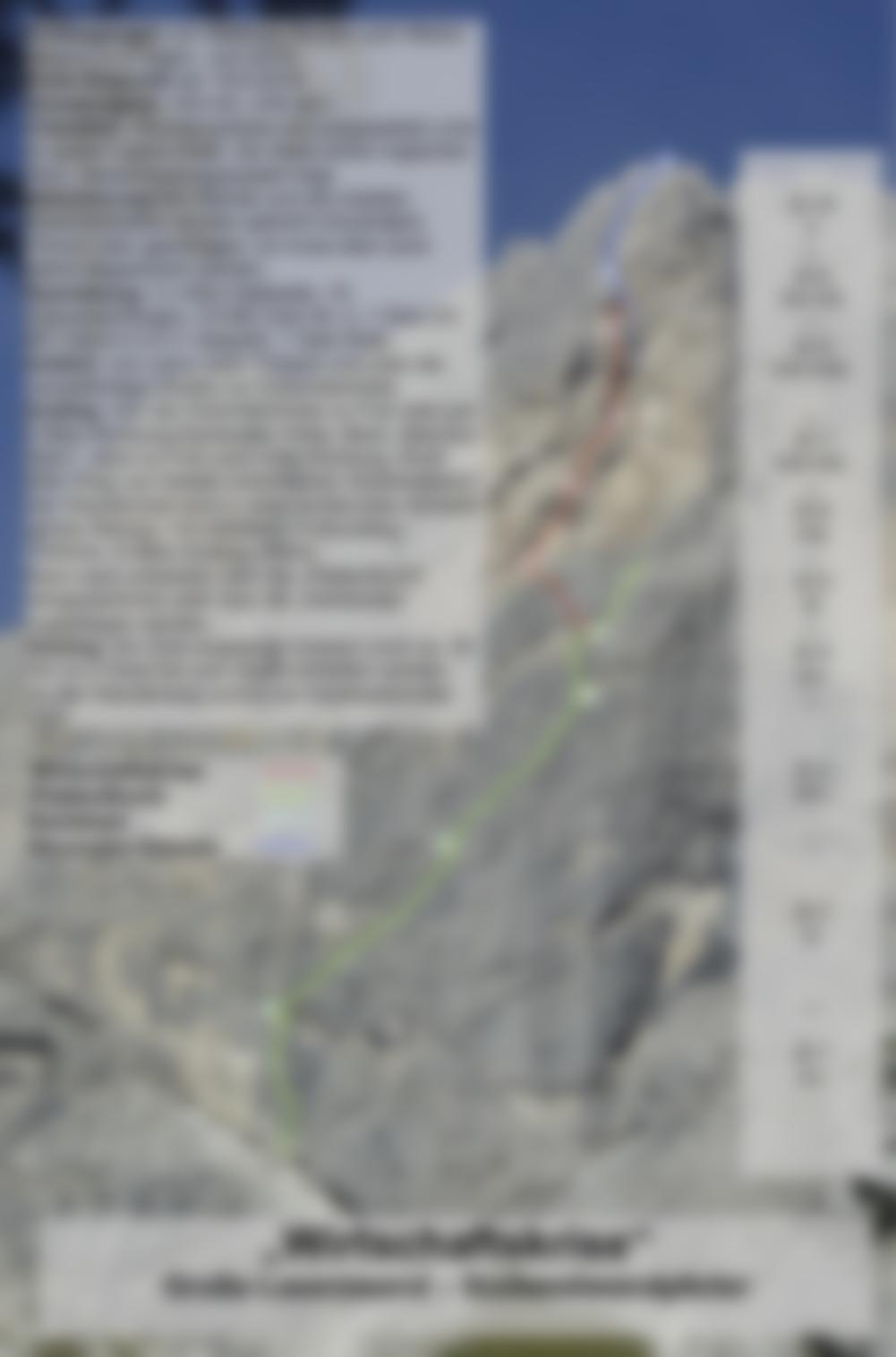 Wunderschöne und ausgesetzte Linie in gutem Laserz-Kalk. Die Route folgt meist einem logischen Riss- und Verschneidungssystem im steilsten Wandteil des Laserzsüdwestwandpfeilers.
