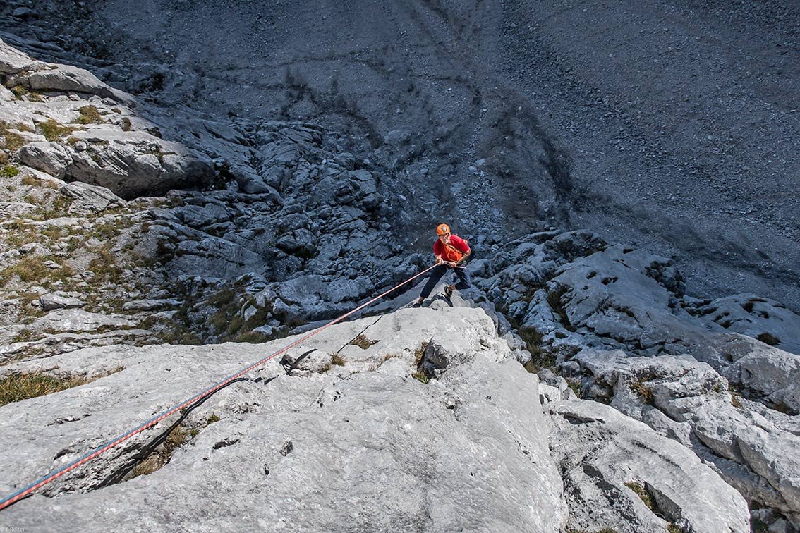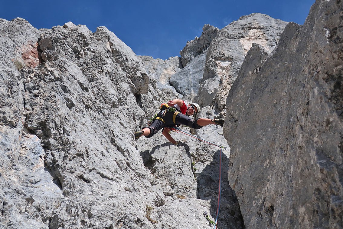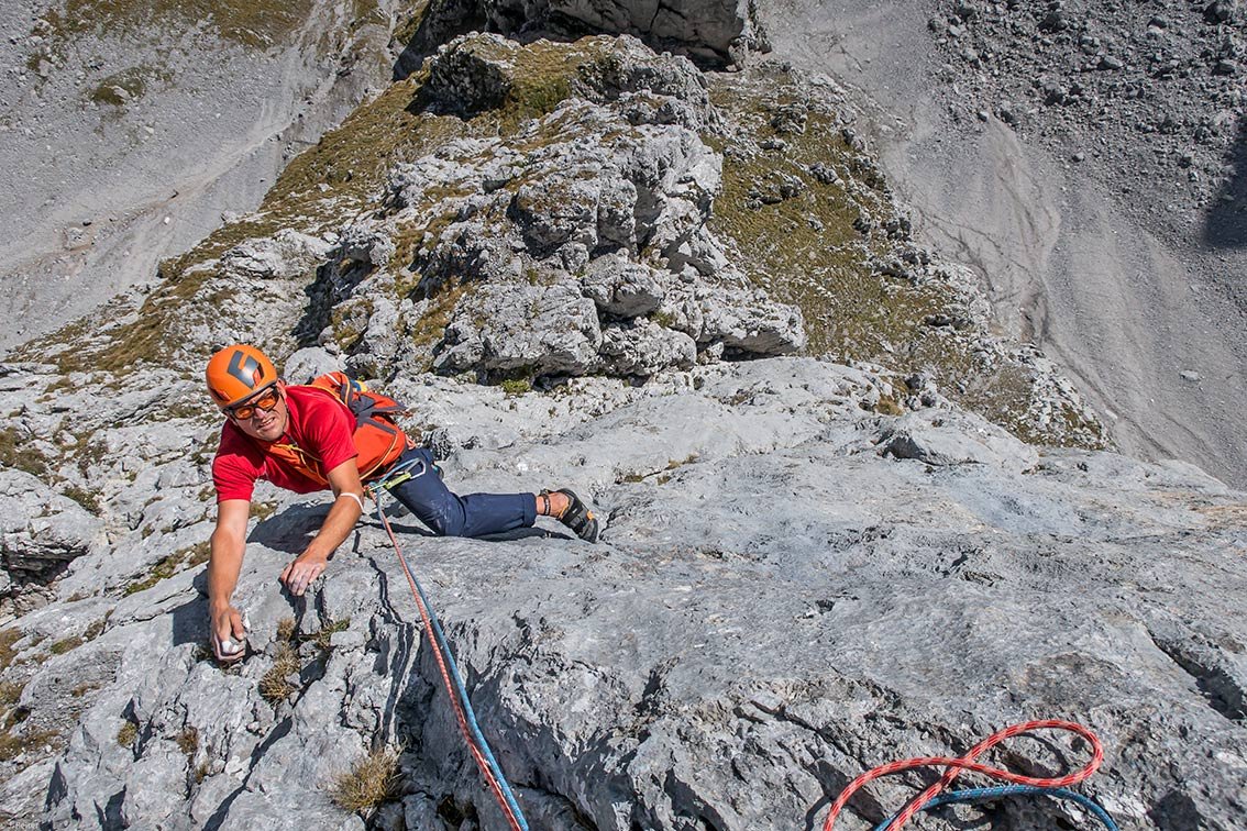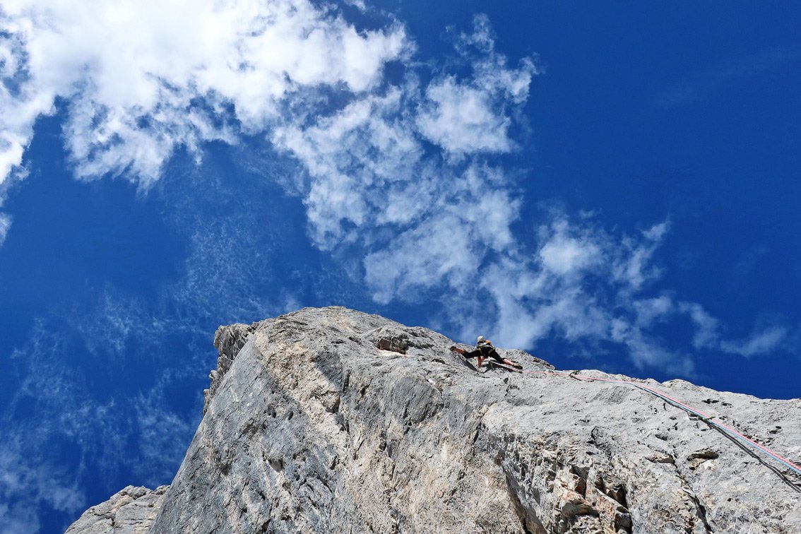 Keine reine Plaisirkletterei - die Route hat auch alpinen Charakter! Der Name „Wirtskante“ kommt von den Sponsoren der Haken, den Wirtsleuten der Gaudeamushütte. Sollte am Einstieg noch ein großes Schneefeld sein, kann der Zustieg etwas heikel werden!