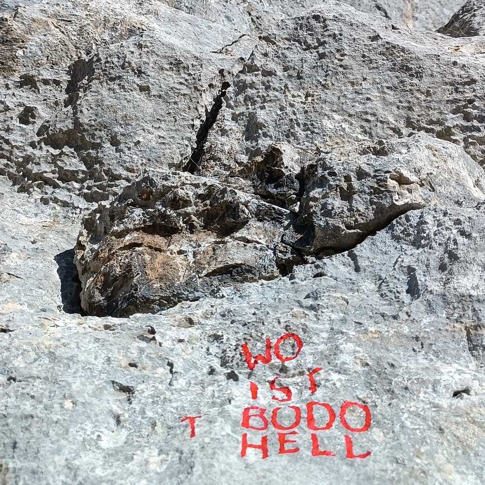 Im gleichen Sommer und am selbigen 9. August arbeitete ich zum dritten Mal an dieser Route - im Solo von unten. Ich genoss den herrlich kompakten Fels und bohrte mich langsam weiter nach oben. Mit keinem Gedanken hätte ich mir vorstellen können, dass ich nur wenige Tage später die Nachricht von meinem Freund Christoph Huber erhalten würde, dass gerade nach Bodo Hell gesucht wird, weil er spurlos verschwunden sei.