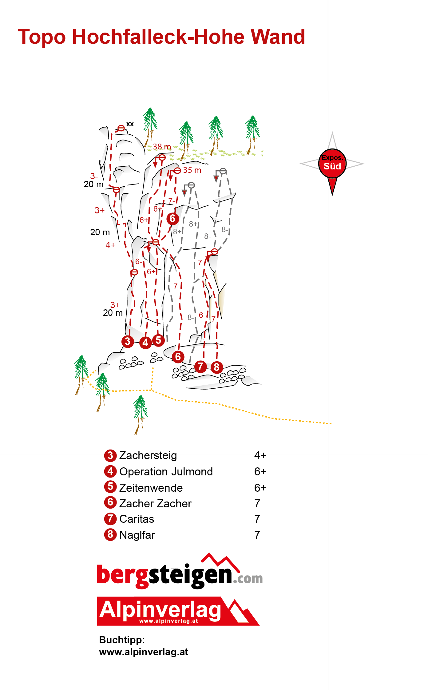 Zwar nicht besonders lang, aber dennoch einer der besten Hohe Wand 4er. Die Route wurde von den Bergführern der Alpinschule Peilstein 2009 saniert und ist sehr gut mit Klebehaken abgesichert. Perfekte Tour für Inversionswetterlagen im Herbst. Wenn unten der Schnee und Hochnebel ruht, klettert man hier oben im T-Shirt. Im Sommer daher sehr heiß, außer der Südwind bläst. :-)