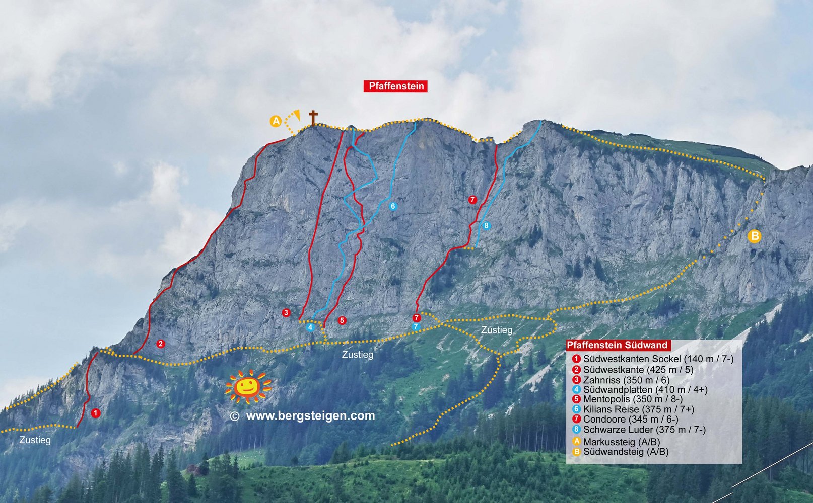Über den Schrabacher Steig ca 50 Meter unterhalb des Südwandfußes links immer in der selben Höhe so lange Wiesen und Schotterrinnen queren bis zu einer markanten Felsrinne . Ringhaken der Südwandplatte sichtbar. Von Ringhaken 15 Meter links queren (auf einem Grasband ) 1 Stand.