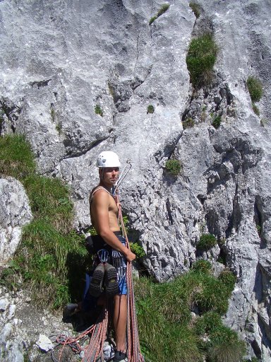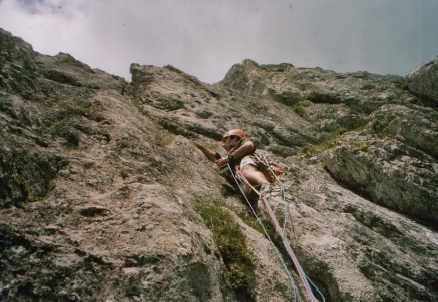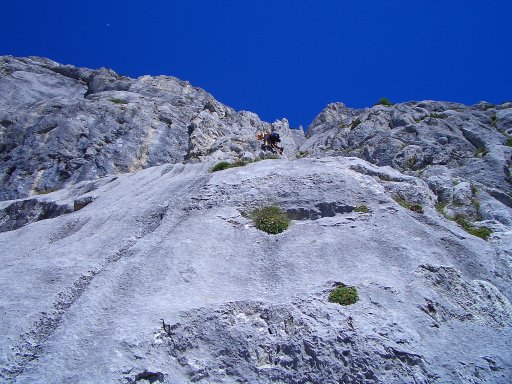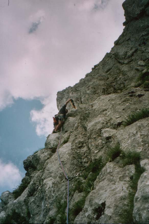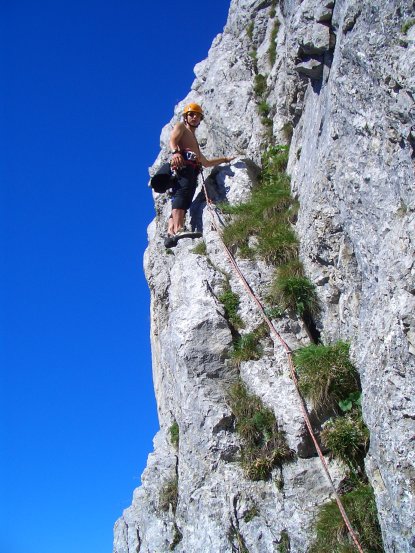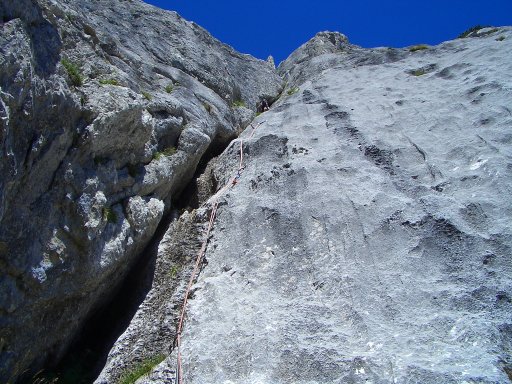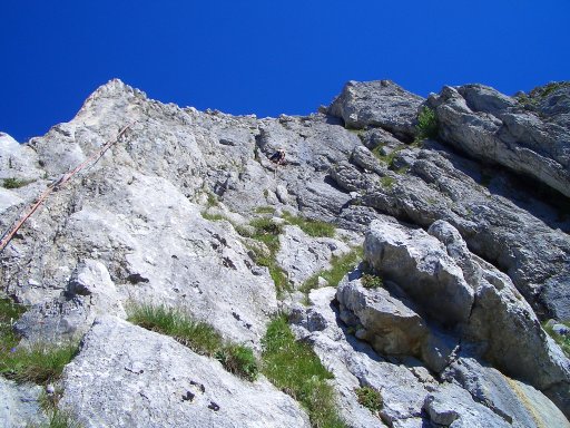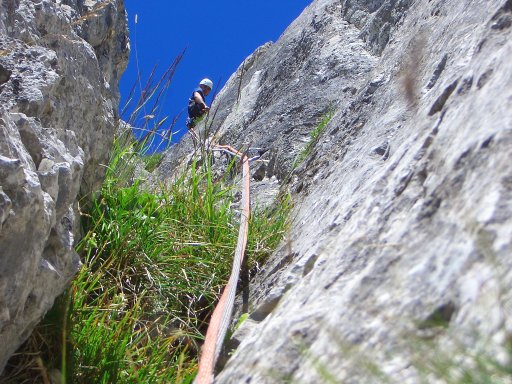2Sl: Vom Stand links nach oben zum 1BH ( vom Stand sichtbar). Bis zum Grat etwas brüchig. Am Grasband den Aufschwung über rechts anklettern.