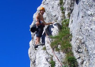 1Sl: Schrofen und Wiesen nach kürzem plattigen Aufschwung. Unbedingt rechts vom Bäumchen ( 2.Bohrhaken)