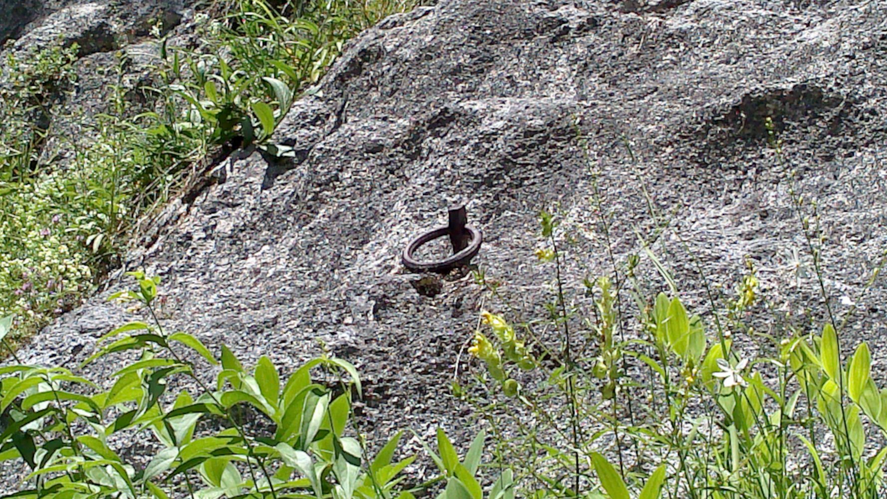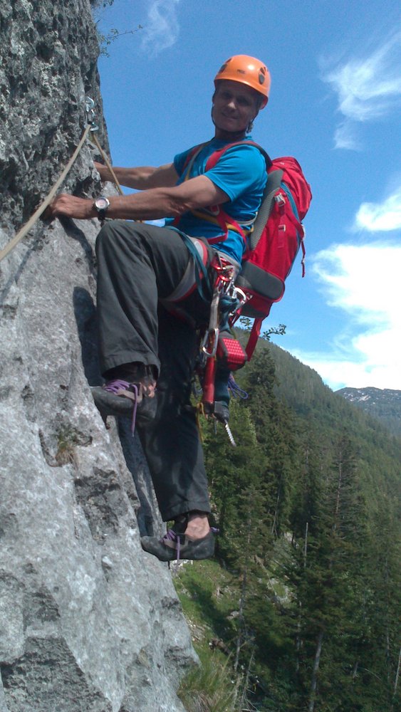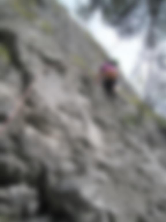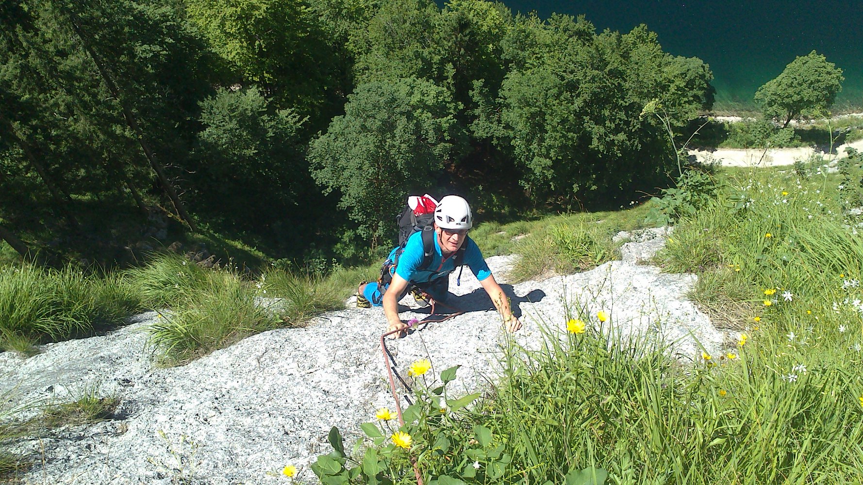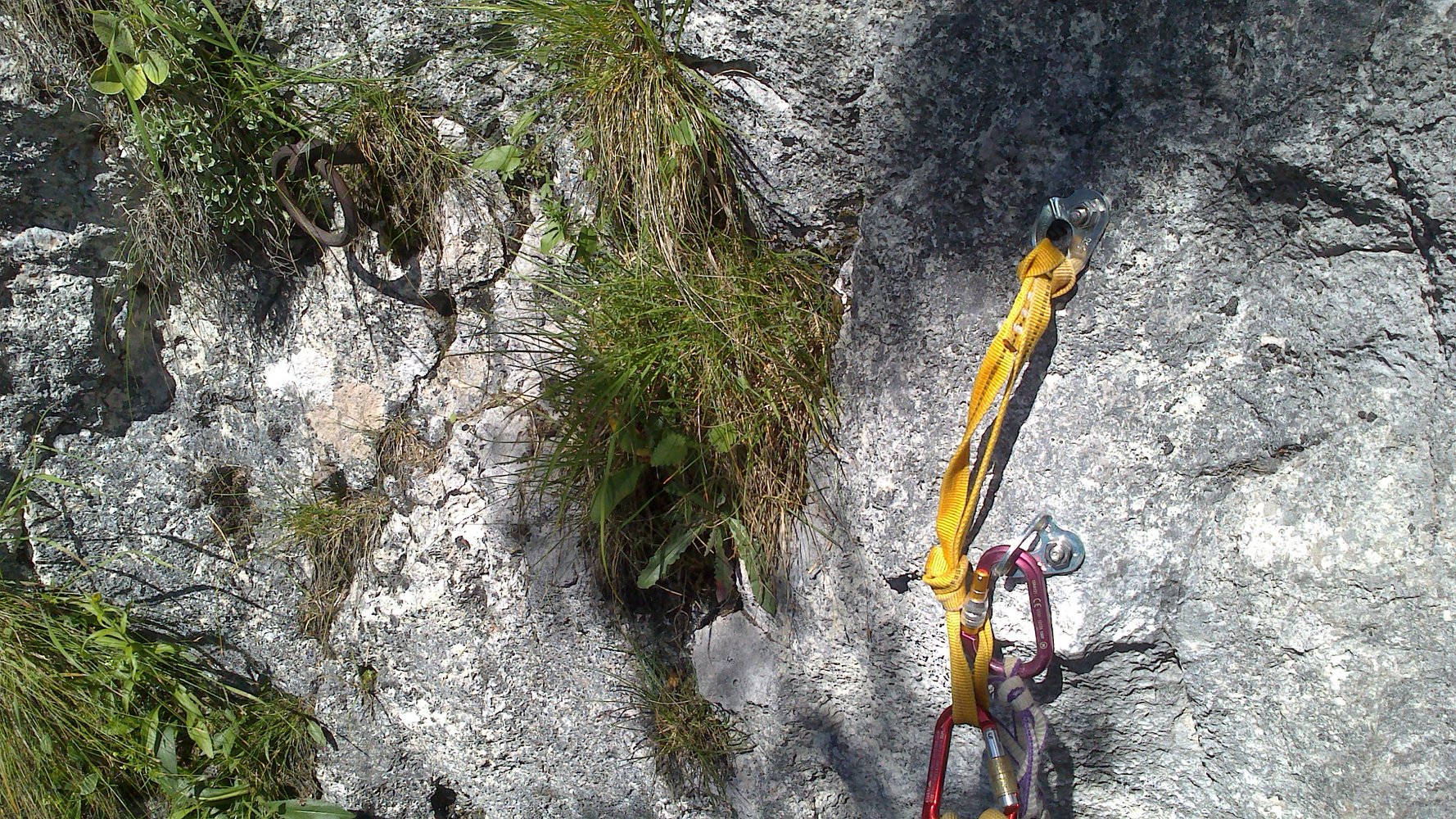 Bohrhaken, in der letzten Seillänge sichert man mit einigen Bandschlingen (die man mitbringen muss) an Bäumchen.