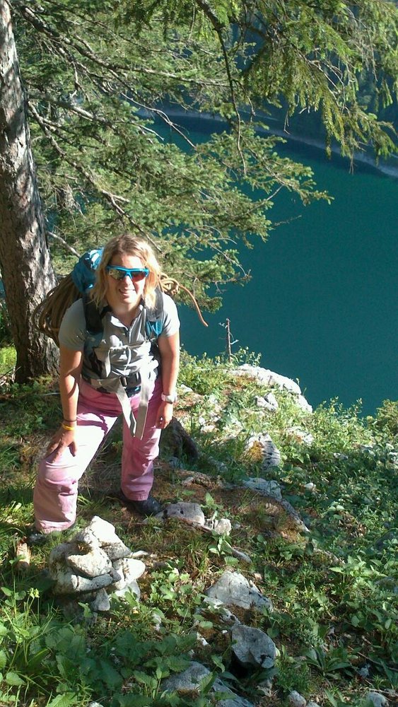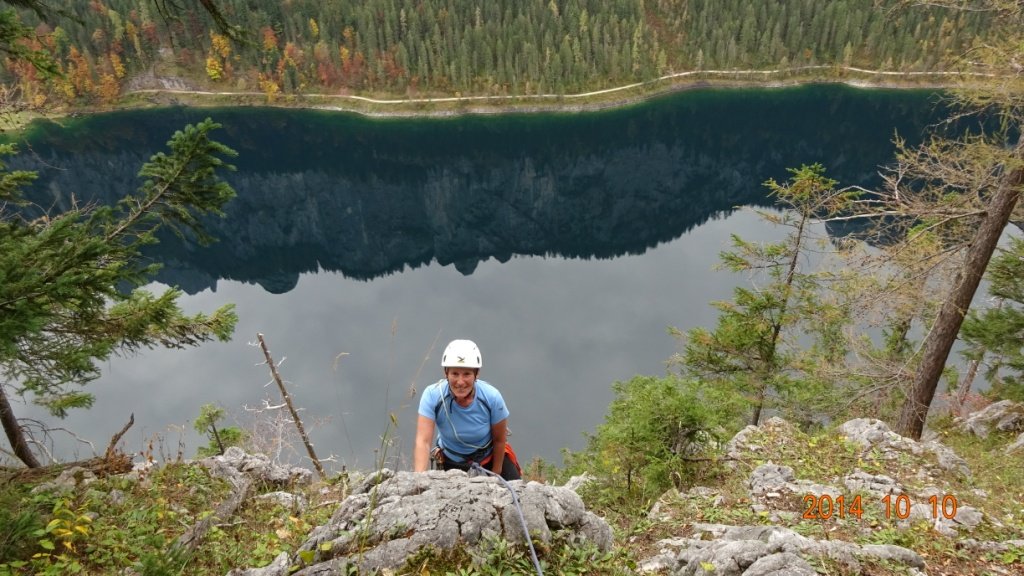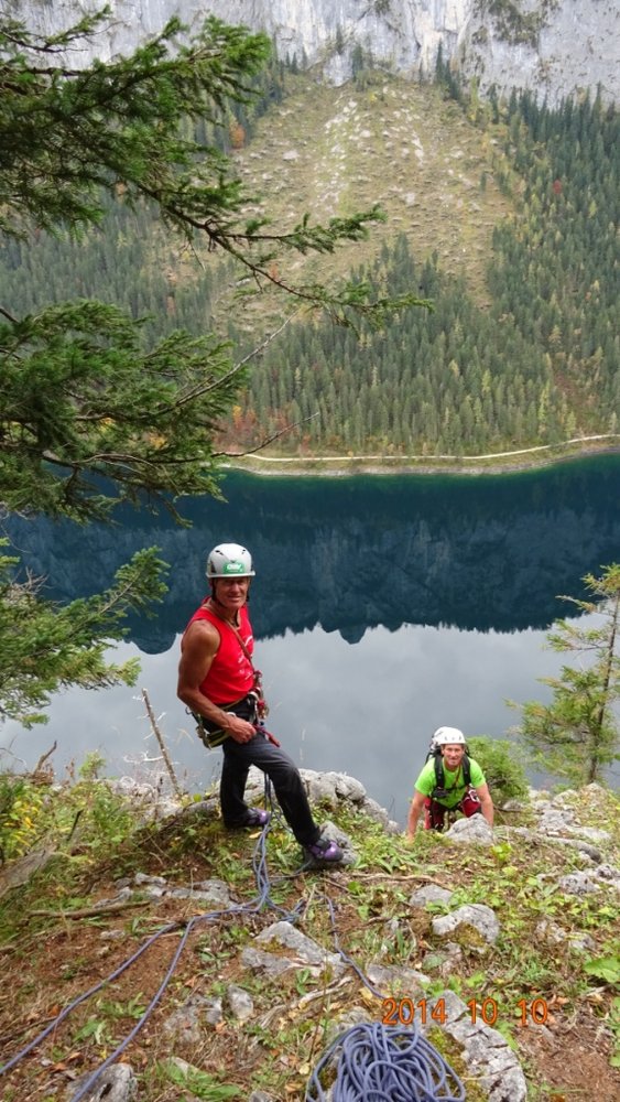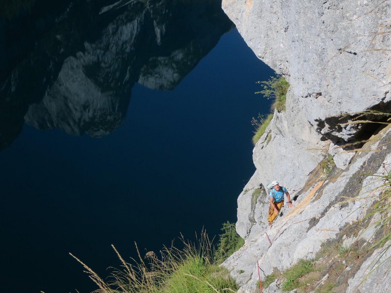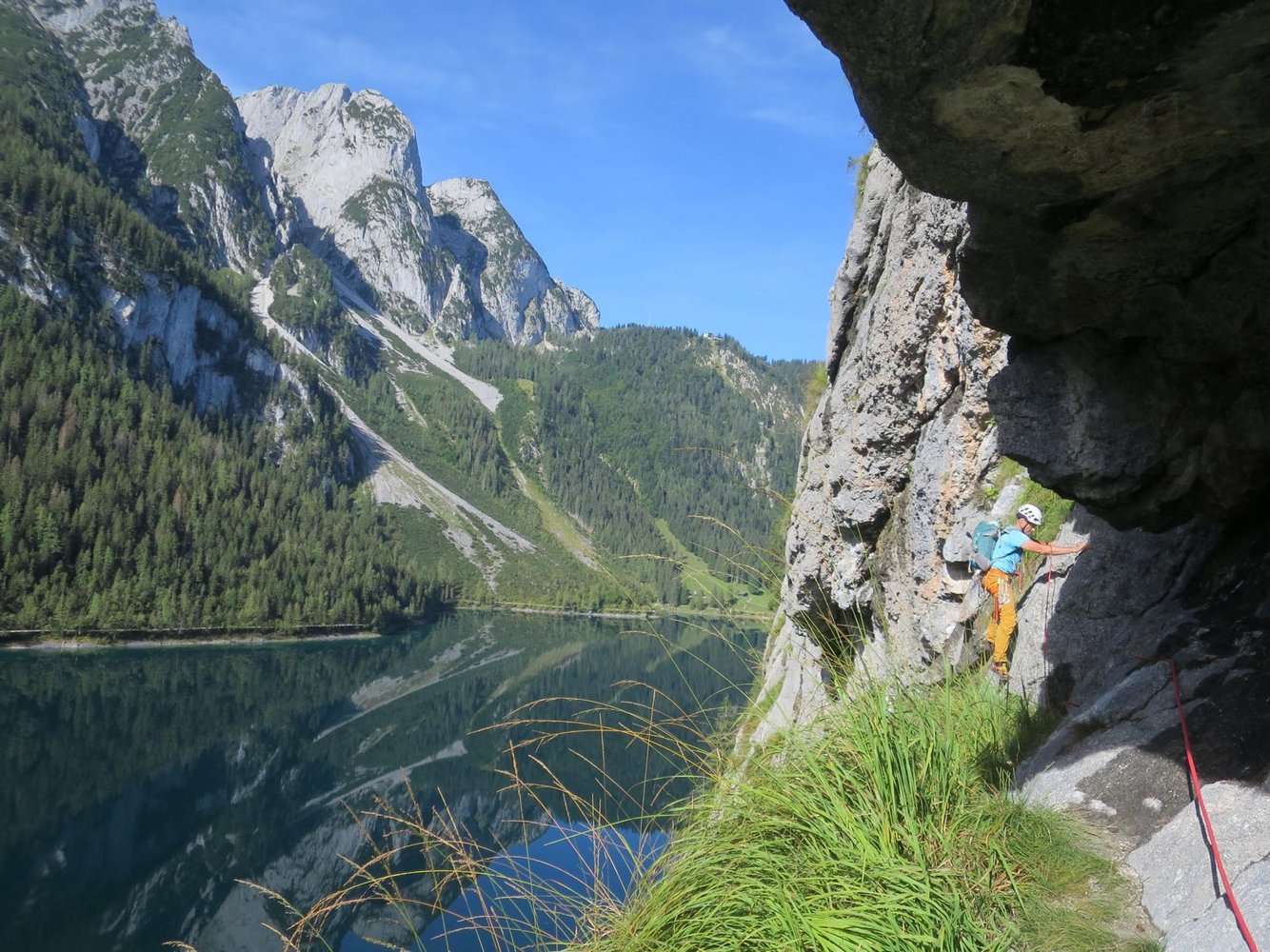 Einstieg am Gosausee Rundweg, ca. 50 m südl. des Kaiserwalzers. Die Route führt diagonal unter Überhängen von links unten nach rechts oben. Vom Ausstieg ca. 10 Min. entlang an Steinmännern zu Forststraße und weiter über die Ebenalm zurück zum Gosausee.
