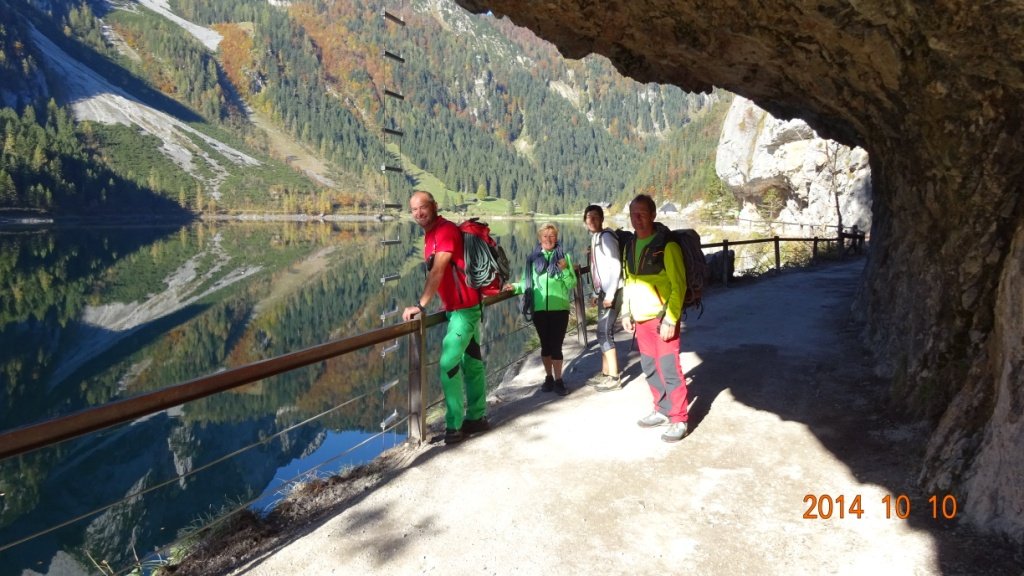 Entlang dem Panorama Rundweg des Vorderen Gosausee, bis zum Laserer-alpin Klettersteig. Nach der in den Fels gesprengten Passage des Wegs ca. 50 m weiter.