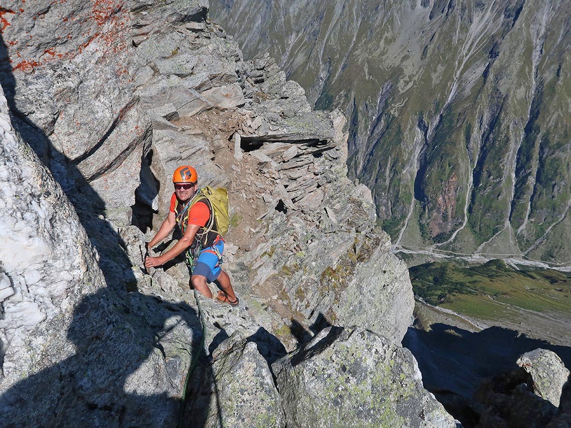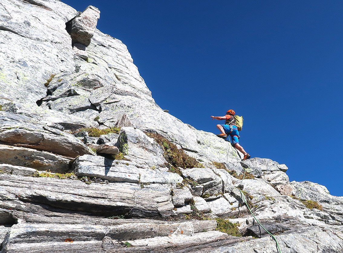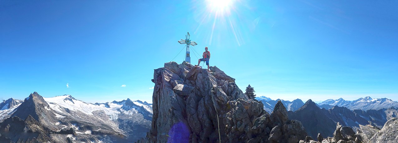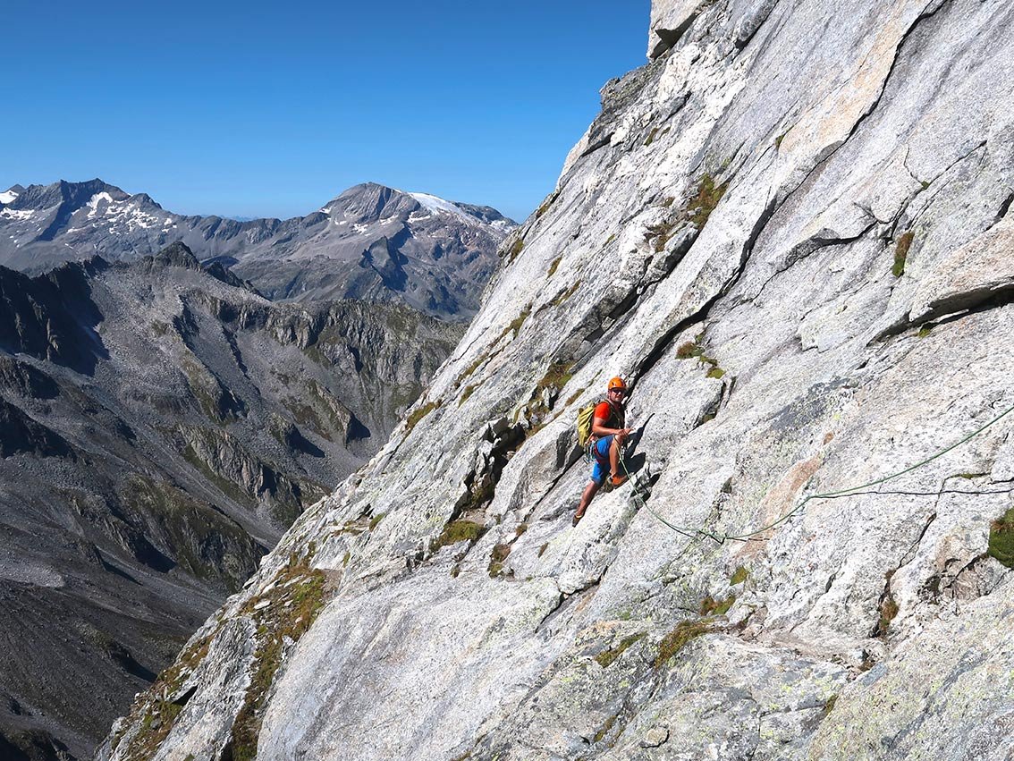 Zsigmondyspitze – auch Feldkopf genannt – wird als „Matterhorn“ des Zillertals bezeichnet. Der Anstieg über den Südgrat ist eine der beliebtesten, leichten Gratanstiege in den Zillertaler Alpen. Bei dieser wunderbaren Tour hat man auch keinen Gletscherkontakt und kann sich voll und ganz auf die anregende Blockkletterei konzentrieren. Auf dem Weg liegt, bzw. ist das bei vielen auch der Ausgangspunkt, die Berliner Hütte. Der denkmalgeschützte Bau ist noch sehr gut erhalten, man sollte auf jeden Fall einen Blick in den Speisesaal und das Treppenhaus werfen. Landschaftlich eindrucksvoll – und wenn man vom Tal kommt ein sehr langes, leichtes Kletterabenteuer im Zillertal.
