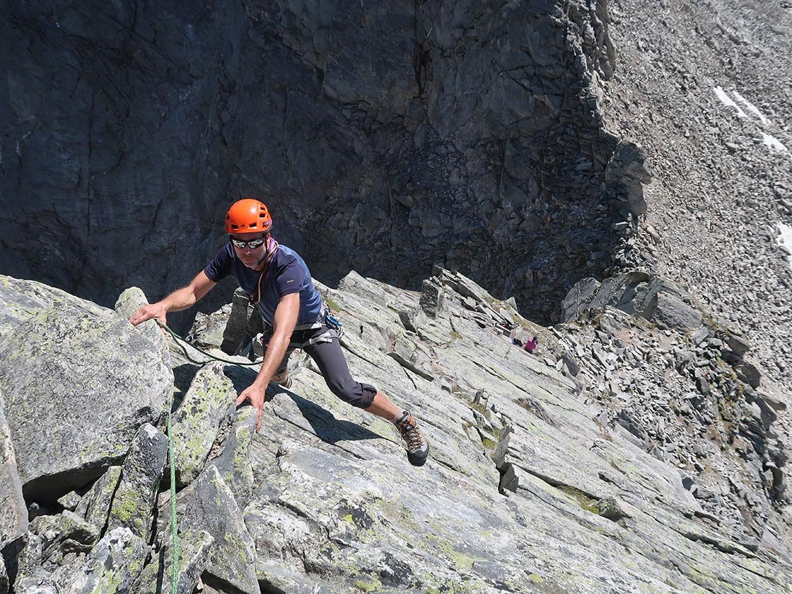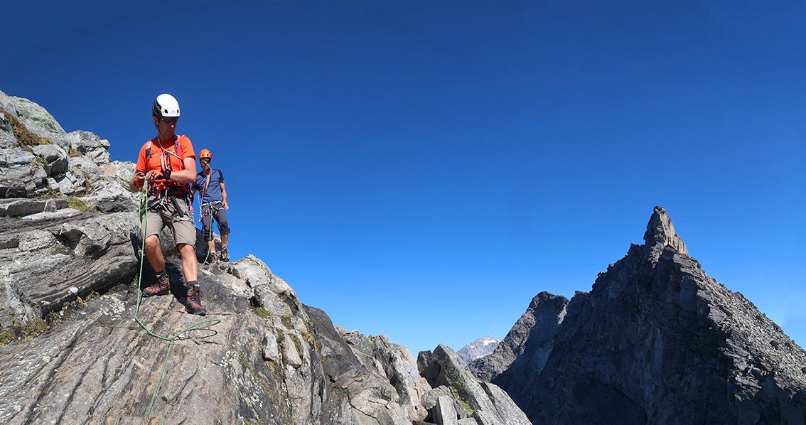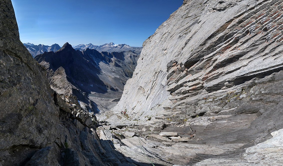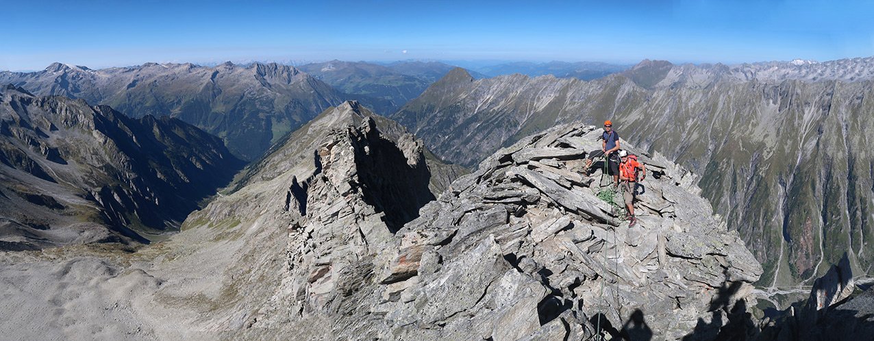 Zsigmondyspitze – auch Feldkopf genannt – wird als „Matterhorn“ des Zillertals bezeichnet. Der Anstieg über den Südgrat ist eine der beliebtesten, leichten Gratanstiege in den Zillertaler Alpen. Bei dieser wunderbaren Tour hat man auch keinen Gletscherkontakt und kann sich voll und ganz auf die anregende Blockkletterei konzentrieren. Auf dem Weg liegt, bzw. ist das bei vielen auch der Ausgangspunkt, die Berliner Hütte. Der denkmalgeschützte Bau ist noch sehr gut erhalten, man sollte auf jeden Fall einen Blick in den Speisesaal und das Treppenhaus werfen. Landschaftlich eindrucksvoll – und wenn man vom Tal kommt ein sehr langes, leichtes Kletterabenteuer im Zillertal.