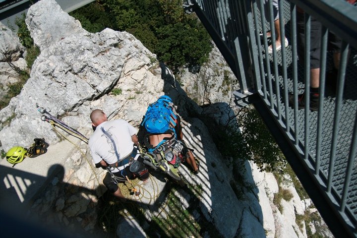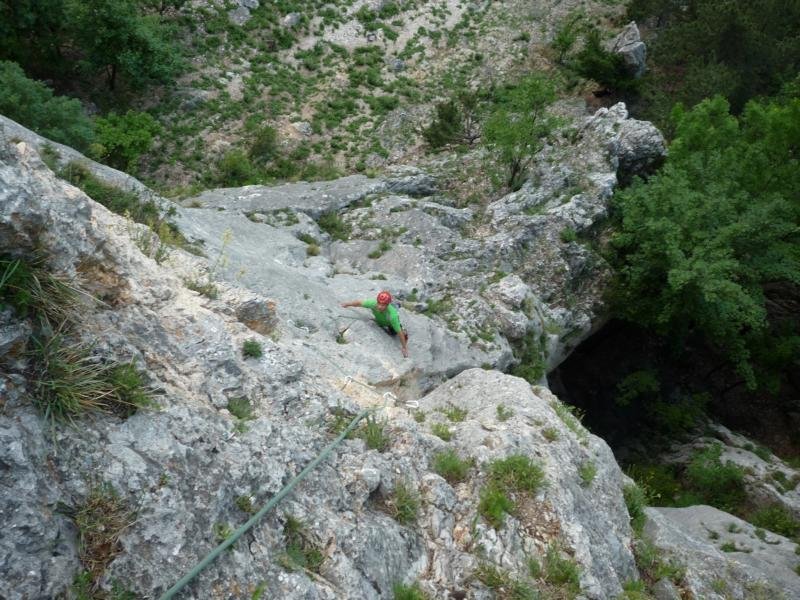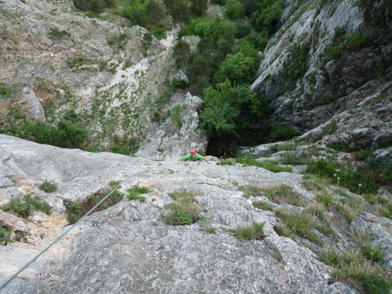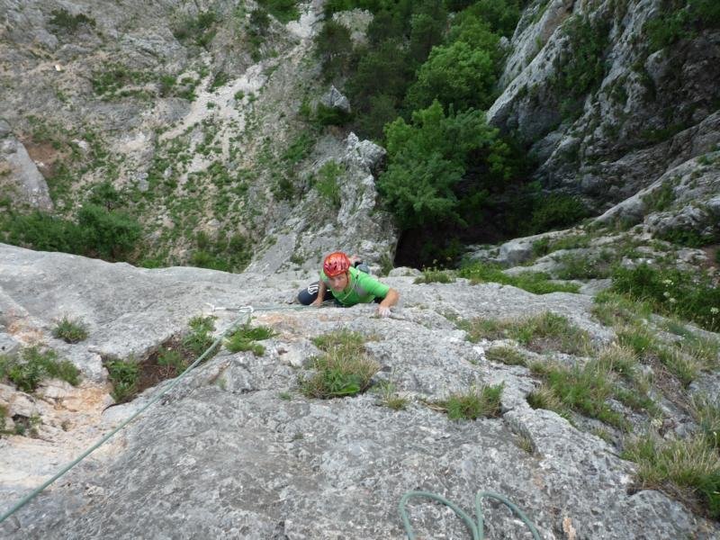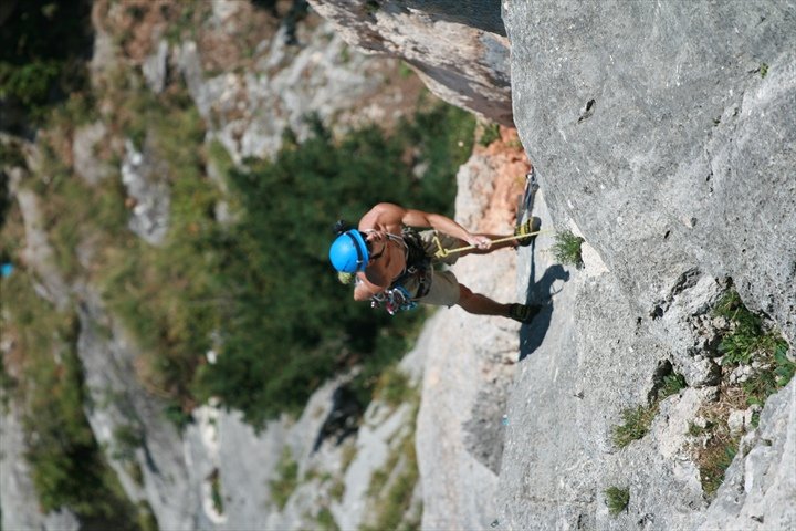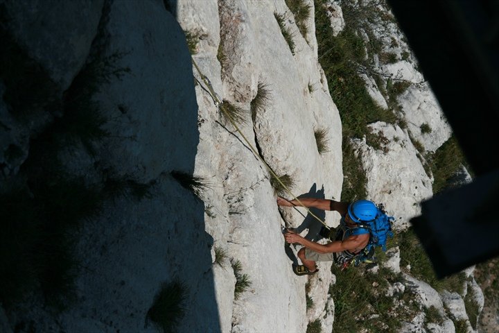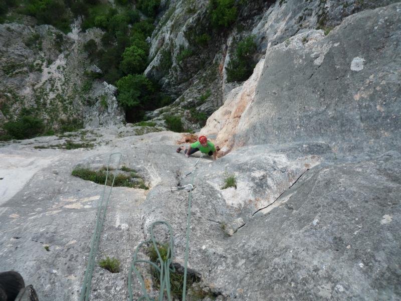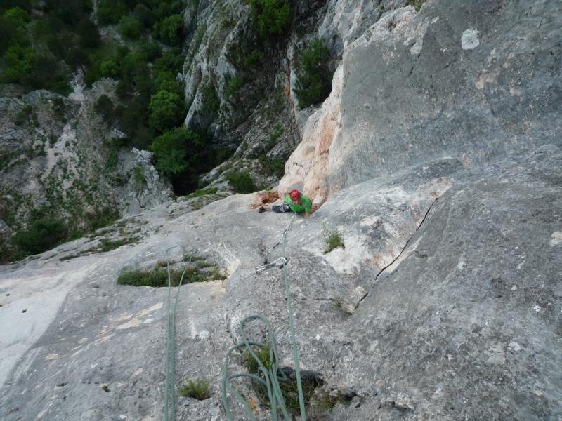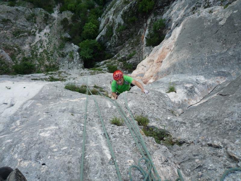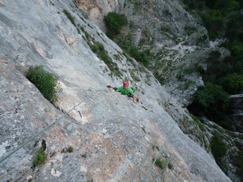 Die Route ist gut mit Bühlerklebehaken (Anm. in der 1. Seillänge norm. Klebehaken)