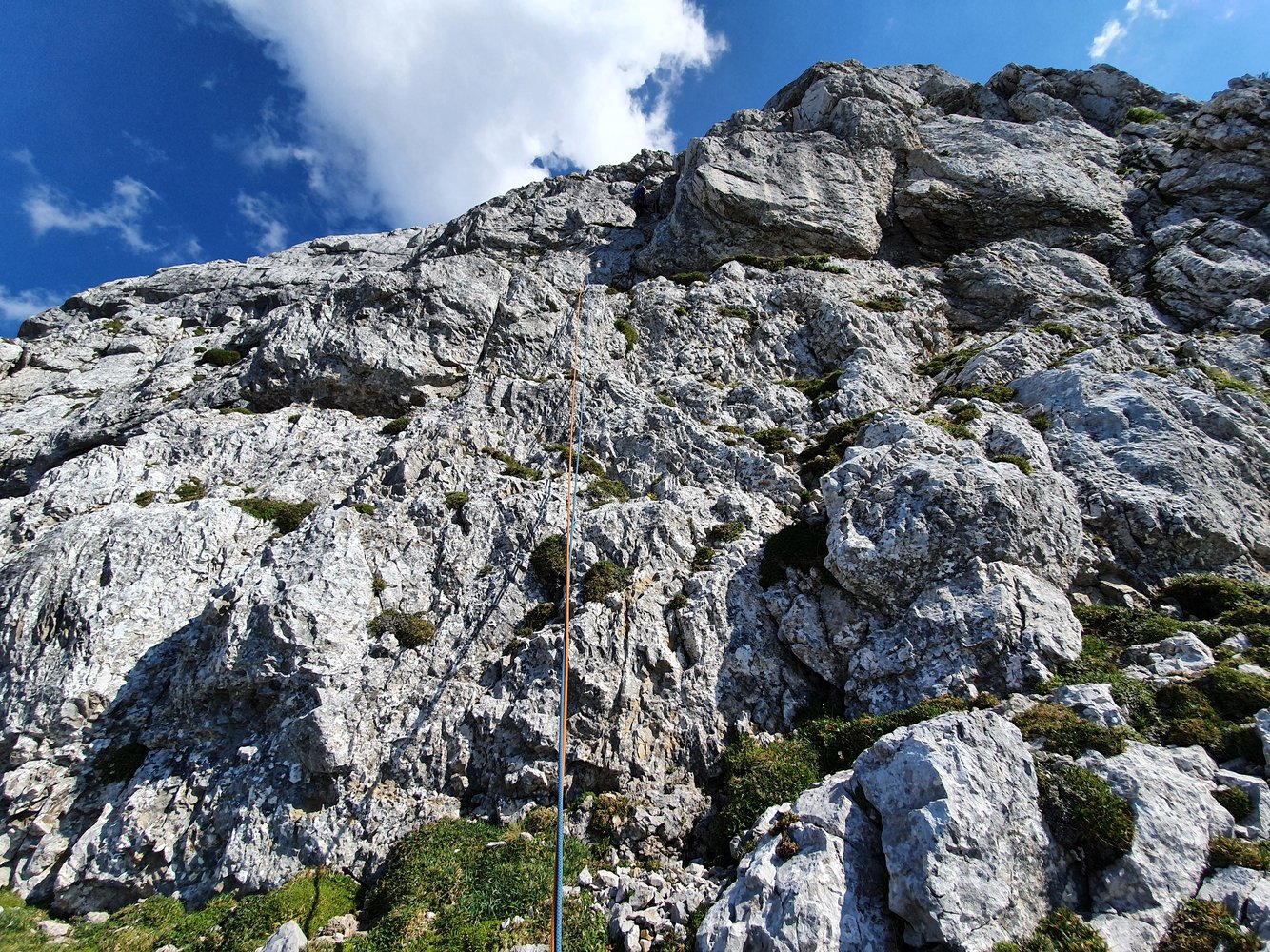 Die erste Seillänge lässt sich über leichtes Schrofengelände auch umgehen. Stand am Ende des Schrofengeländes unter der markanten Headwall bei angelehnter Schuppe.