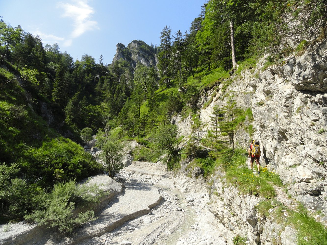 Dieser eher unbekannte Anstieg der Buchsteingruppe führt durch das Schotterwerk in den Billbachgraben und entlang des Holzzieherweges direkt zum Wandfuß der Frauenmauer NW-Wand. Weg ist in sehr gutem Zustand und hervorragend markiert. Wenn der Weg zum ersten Mal den Wandfuß erreicht (Bankerl) folgt man diesem ca. 200m nach links bis zum Einstieg nach einem markanten, vorgelagerten Turm, bei einem Bohrhaken.