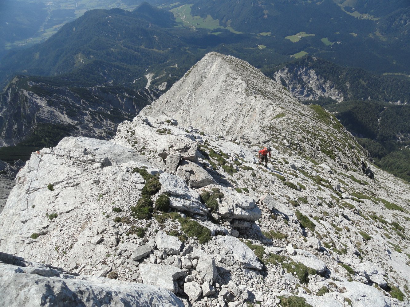Vom letzten Stand folgt man noch ca. 20min dem schrofigen Rücken (I-II) bis zum Gipfel der Frauenmauer. Von dort über leichte Wiesenhänge hinunter in die Buchsteinscharte und weiter hinunter in die Westschlucht bis man wieder zum Wandfuß kommt oder frühzeitig abzweigen Richtung Buchsteinhaus. Alternativ ist die Route auch zum Abseilen eingerichtet. (Abseilstände siehe Topo)