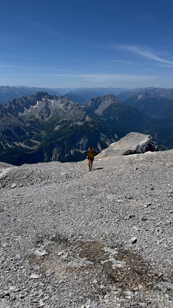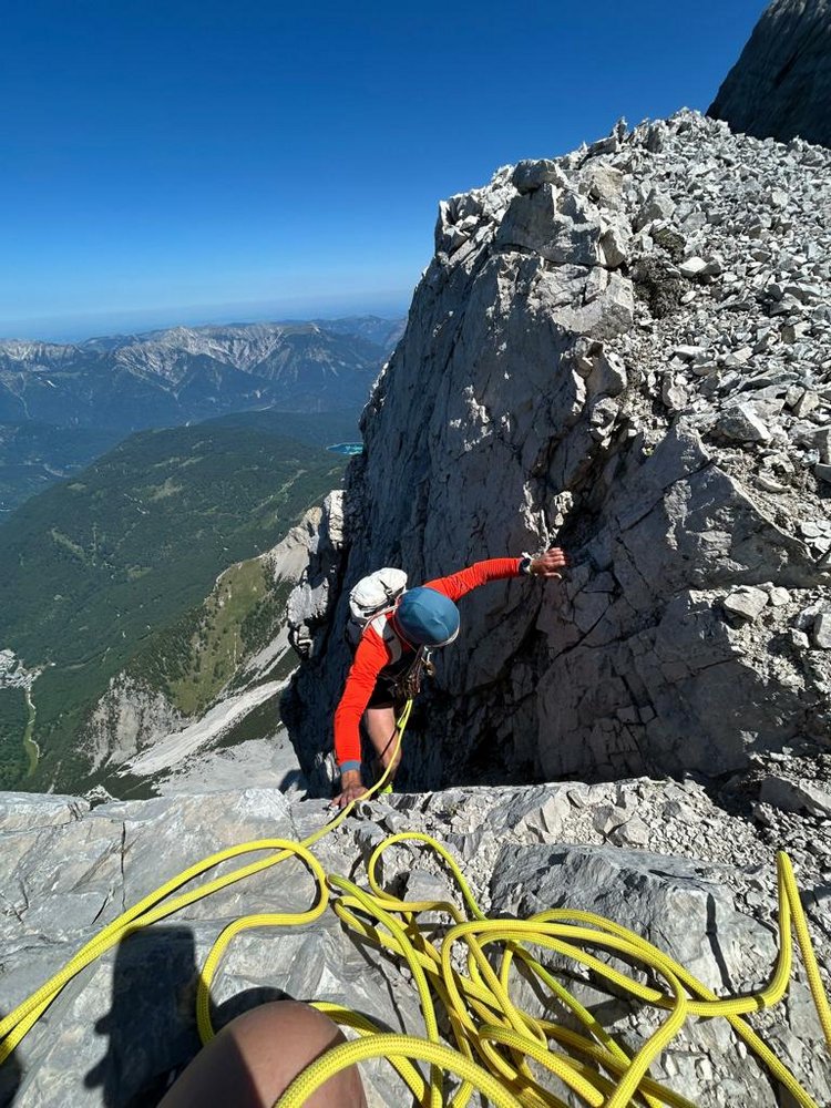 Die Route "Zwischen den Toren" ist eine logische Linie durch die Westwand des Schneefernerkopf. Alpines Gesamterlebnis, brüchiger Fels und wenige kompakte Klettermeter beschreiben diese Route recht gut. Es ist auf jeden Fall ein Erlebnis, die 1315 Klettermeter zügig zurückzulegen, wenngleich die Felsqualität im Großteil der Tour nicht immer gut ist. Die Route ist zwar durchgebohrt, der Anstieg ist aber keine Plaisiertour. Im unteren Teil, fanden wir manche Kletterpassagen wie das Testwändli sowie die Seillänge danach etwas erzwungen, diese kann man nämlich im leichten Gelände einfach umgehen (und ist so schneller am Ziel). Die Routenfindung ist nie wirklich schwer und meist sehr logisch.