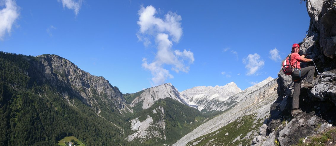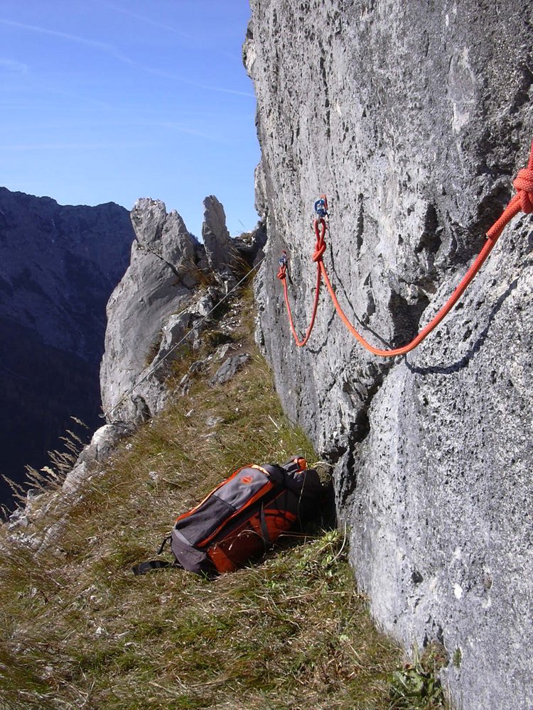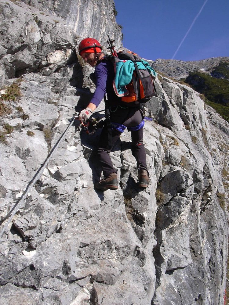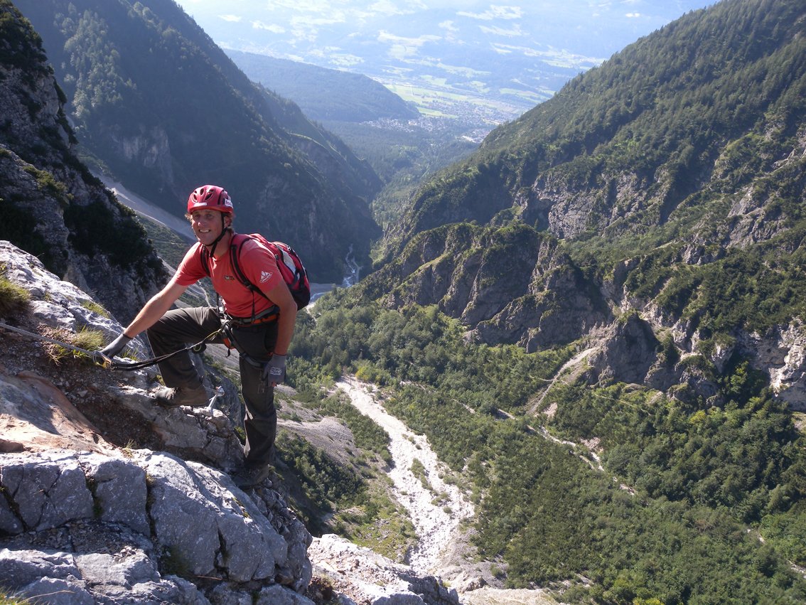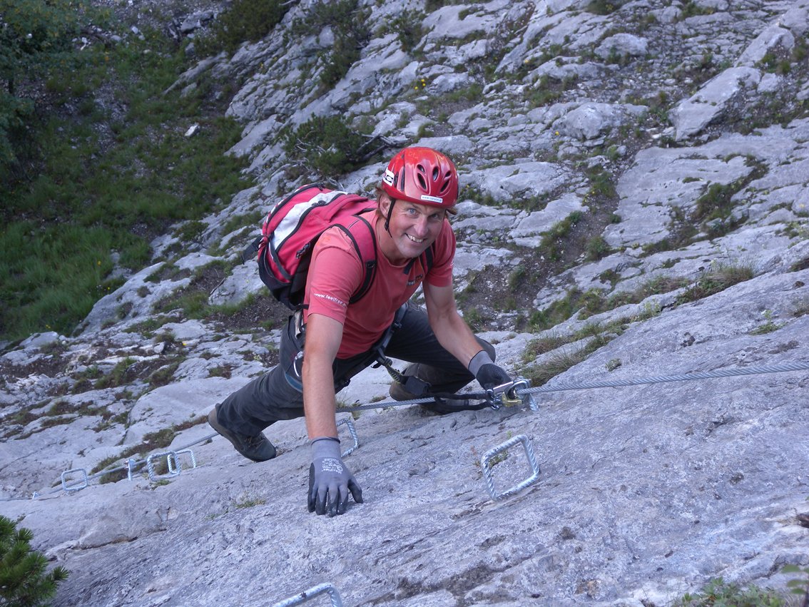 Komplette Klettersteigausrüstung und vor allem Helm!