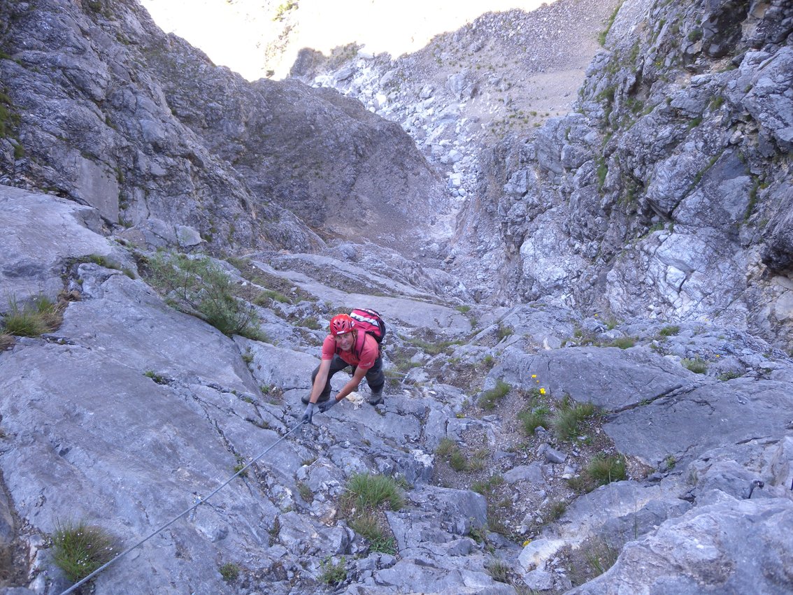 Der Abstieg auf dem AV-Weg 222 erfordert Trittsicherheit - die Tour ist also nicht für Kinder geeignet. Die beiden Schluchtquerungen, vor allem die zweite sollten zügig gemacht werden - Steinschlaggefahr.