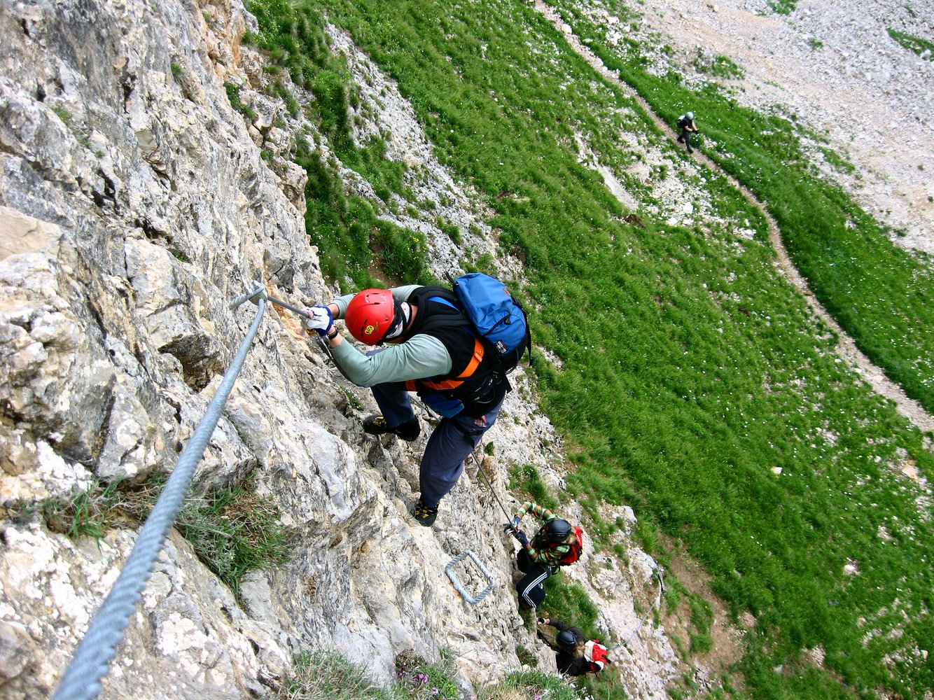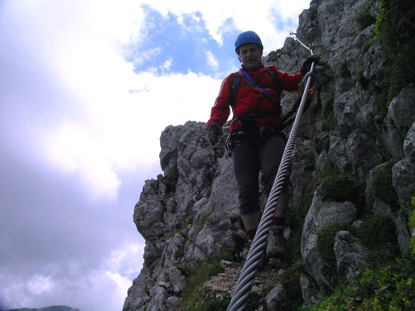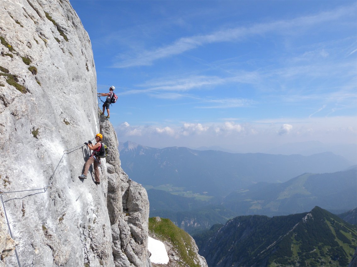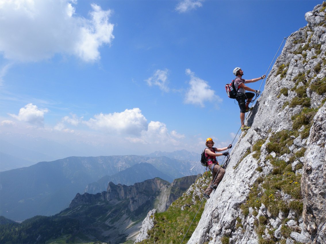 Komplette Klettersteigausrüstung und Helm; für schwächere Geher und Kinder ein kurzes Sicherungsseil.