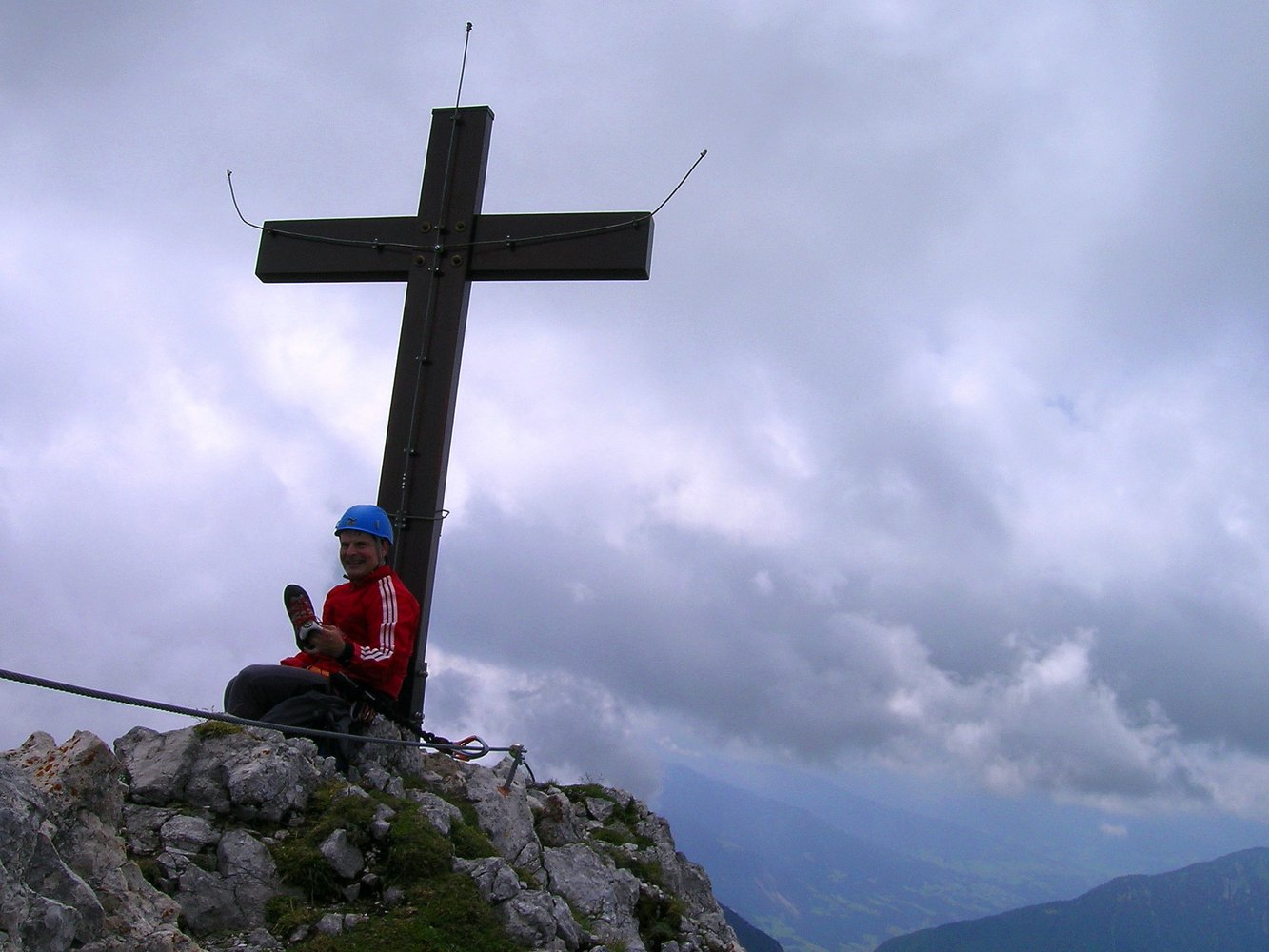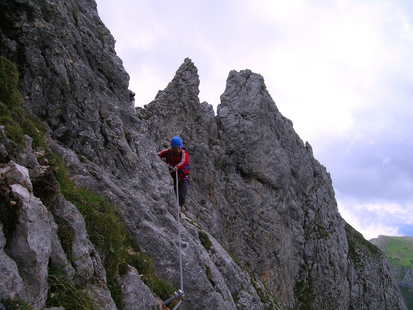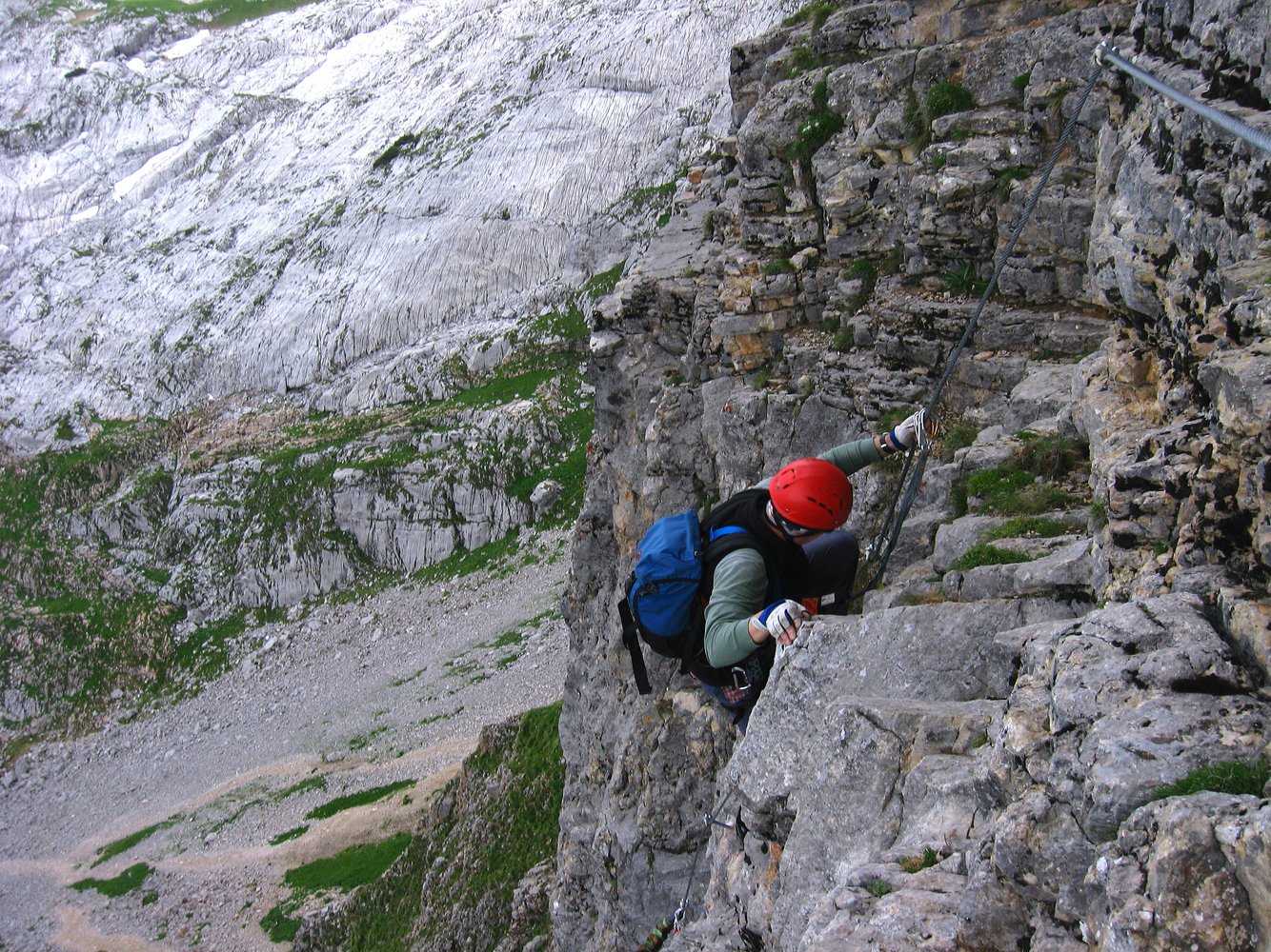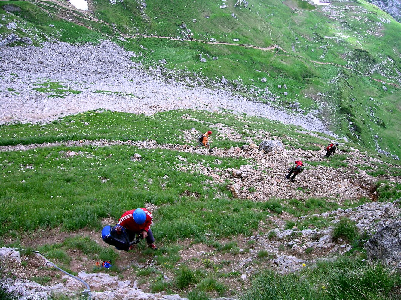 Komplette Klettersteigausrüstung und Helm; für schwächere Geher und Kinder ein kurzes Sicherungsseil.