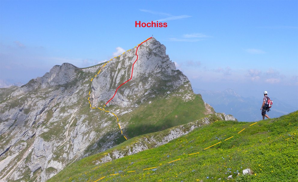 Vom Gipfel des Hochiss auf dem markierten Wanderweg zurück zur Bergstation der Seilbahn.