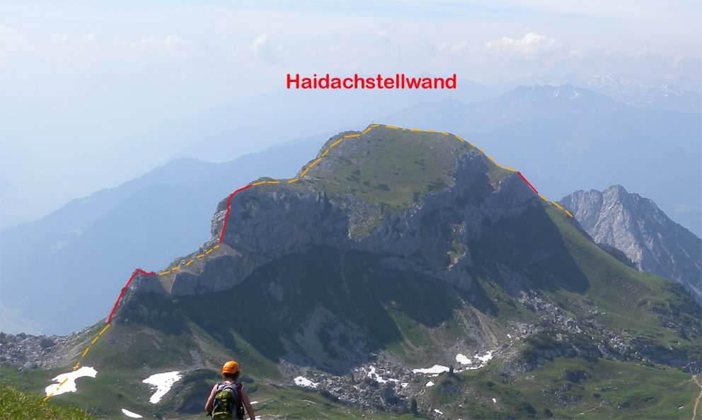 Bei viel Betrieb und schönem Wetter steigt man besser auf dem Nordgrat (B/C) auf die Haidachstellwand und geht hinten auf dem Wanderweg hinunter (sonst oft Gegenverkehr).