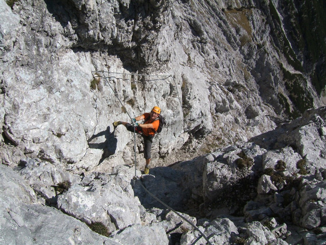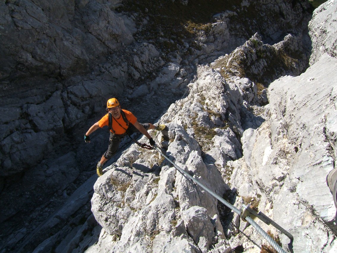 Gut mit Dickem Stahlseil gesichert. Am Beginn der Gelben Welle gibt es eine etwas ungute Stelle, dort sind die Klammern einfach zu hoch beim Seil.