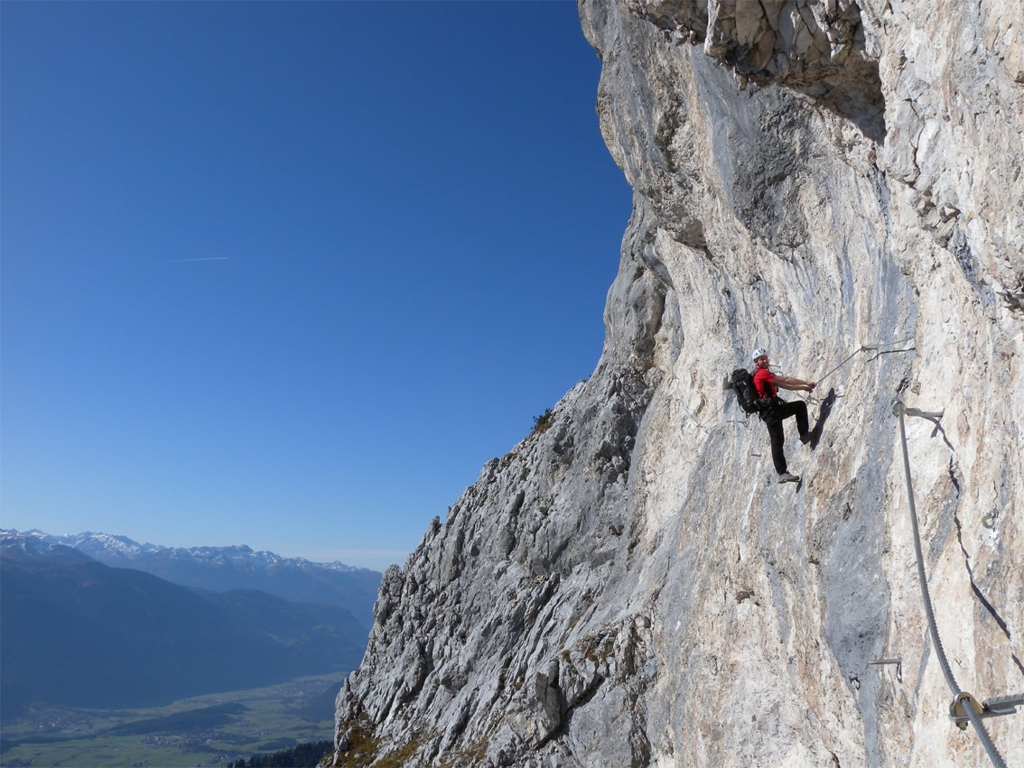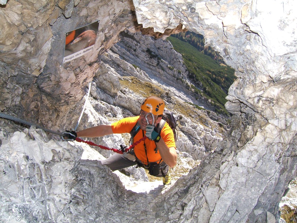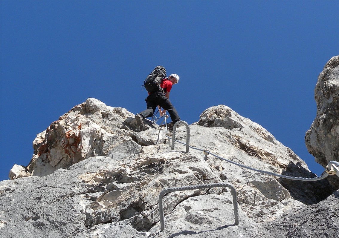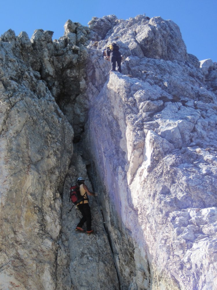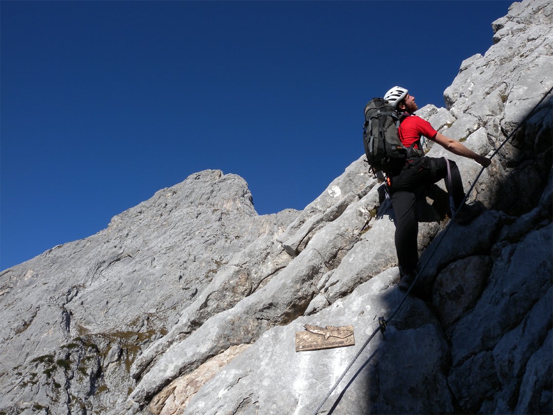 Vom Einstieg auf der Westseite knapp unterhalb, später auf dem Grat (A u. A/B) zu einer Gehpassage die einen zum Beginn einer steilen Wand führt. Diese aufwärts (B/C) und am Ende sehr steil (C) auf die Kante, kurz hinunter (B) in leichtes Gelände (A). Erneut rechts einer Kante (B/C) aufwärts und oben plattig (C) um die Ecke. Steiles, gestuftes Gelände (B und B/C) führt zur nächsten, luftigen Plattenstelle (C). Nach dieser auf eine Rippe (B/C), danach Querung (C) zu einem Pfeiler. Der steile Einstieg (D) ist die Schlüsselstelle, danach C, beim Ausstieg wieder C/D und man hat den ersten Pfeiler fast geschafft. Kurz leichter (C) zum letzten, nur kurzen Aufschwung (C/D) vor dem Grat. Auf dem Grat westwärts (A, A/B) leicht absteigend und am Ende, bei einer Notfallbox, gehend zu einer Rinne. In dieser (A/B) südlich hinunter und über eine glatte Rampe (C/D) zum Beginn einer immer leichter werdenden Querung (B/C, dann A/B). An einer Kante steiler hinauf (C/D) zum „Auge des Adlers“ – eine Höhle wird durchschritten (C), danach führt eine schwere, aber kurze Querung (C/D) in leichtes Gelände. Querend (A u. A/B) erreicht man den Beginn der gelben Wand. Diese quert man immer recht luftig (C) zu einer steilen Rampe. Am Beginn und am Ende schwer (C/D), erreicht man den Grat (A) und gelangt (Gehstelle) zum nächsten Grataufschwung (B). Nach diesem quert man zu einem Spalt (B/C) und erreicht leicht (A und B) den Beginn eines Kamins. In diesem rechts aufwärts (B/C), oben dann luftig auf die andere Kaminseite queren (C) und über Steilstück (C/D) höher. Wieder sehr steil und luftig (C/D und C) erreicht man die „Riesenplatte“ (A). Über diese zu einer steilen Verschneidung (C/D), an deren Ende man an den Grat quert (C), über welchen man zum Ausstieg bei einer Tafel gelangt (B).