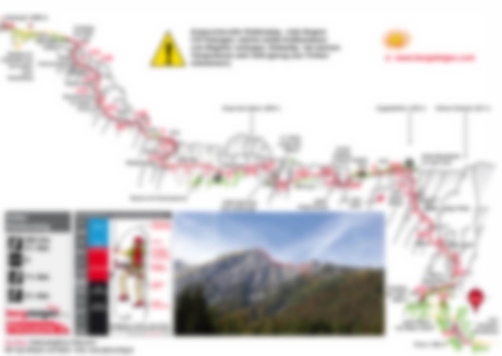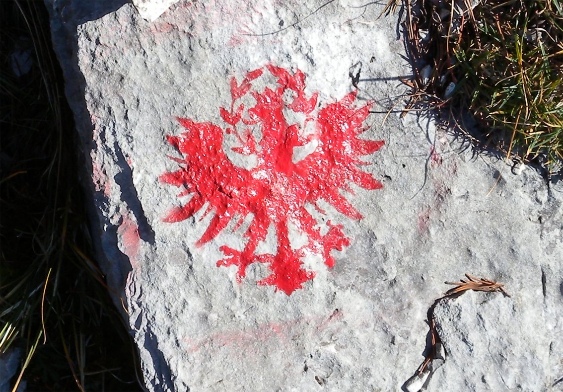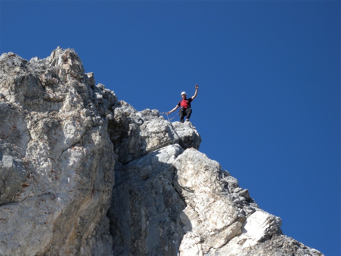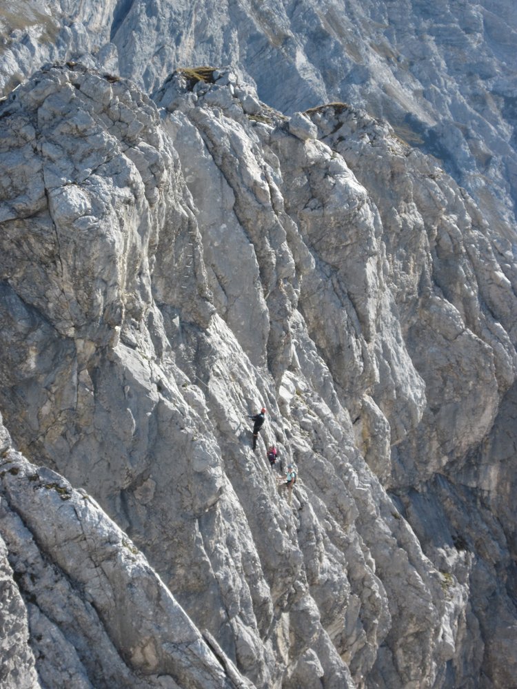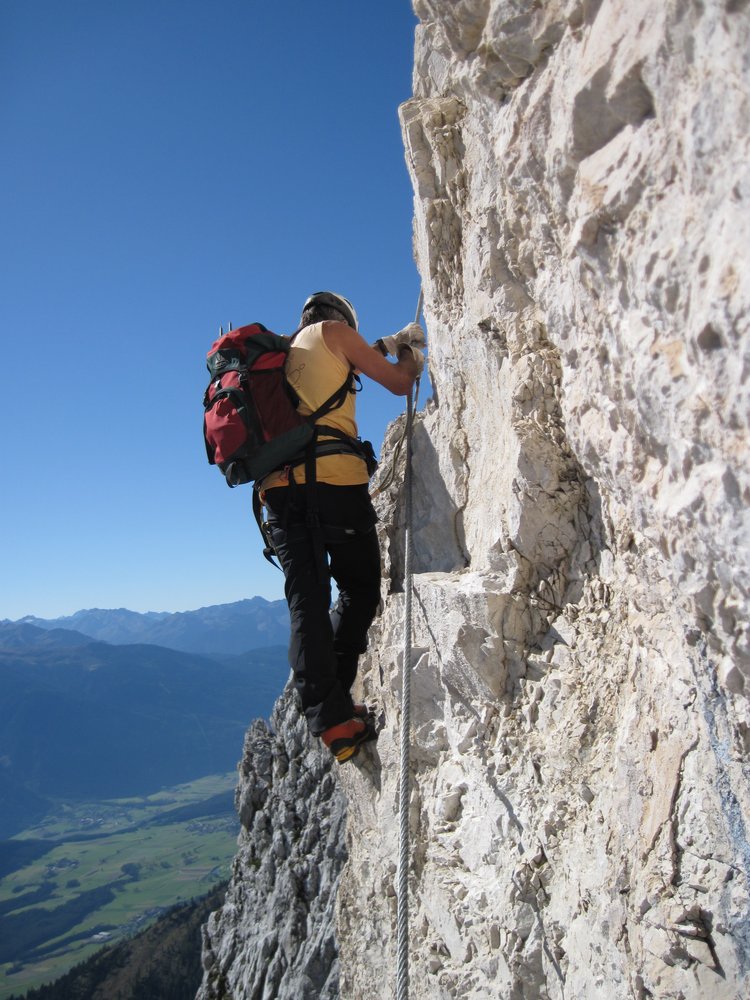 Vom Einstieg auf der Westseite knapp unterhalb, später auf dem Grat (A u. A/B) zu einer Gehpassage die einen zum Beginn einer steilen Wand führt. Diese aufwärts (B/C) und am Ende sehr steil (C) auf die Kante, kurz hinunter (B) in leichtes Gelände (A). Erneut rechts einer Kante (B/C) aufwärts und oben plattig (C) um die Ecke. Steiles, gestuftes Gelände (B und B/C) führt zur nächsten, luftigen Plattenstelle (C). Nach dieser auf eine Rippe (B/C), danach Querung (C) zu einem Pfeiler. Der steile Einstieg (D) ist die Schlüsselstelle, danach C, beim Ausstieg wieder C/D und man hat den ersten Pfeiler fast geschafft. Kurz leichter (C) zum letzten, nur kurzen Aufschwung (C/D) vor dem Grat. Auf dem Grat westwärts (A, A/B) leicht absteigend und am Ende, bei einer Notfallbox, gehend zu einer Rinne. In dieser (A/B) südlich hinunter und über eine glatte Rampe (C/D) zum Beginn einer immer leichter werdenden Querung (B/C, dann A/B). An einer Kante steiler hinauf (C/D) zum „Auge des Adlers“ – eine Höhle wird durchschritten (C), danach führt eine schwere, aber kurze Querung (C/D) in leichtes Gelände. Querend (A u. A/B) erreicht man den Beginn der gelben Wand. Diese quert man immer recht luftig (C) zu einer steilen Rampe. Am Beginn und am Ende schwer (C/D), erreicht man den Grat (A) und gelangt (Gehstelle) zum nächsten Grataufschwung (B). Nach diesem quert man zu einem Spalt (B/C) und erreicht leicht (A und B) den Beginn eines Kamins. In diesem rechts aufwärts (B/C), oben dann luftig auf die andere Kaminseite queren (C) und über Steilstück (C/D) höher. Wieder sehr steil und luftig (C/D und C) erreicht man die „Riesenplatte“ (A). Über diese zu einer steilen Verschneidung (C/D), an deren Ende man an den Grat quert (C), über welchen man zum Ausstieg bei einer Tafel gelangt (B).