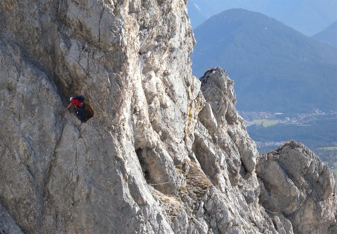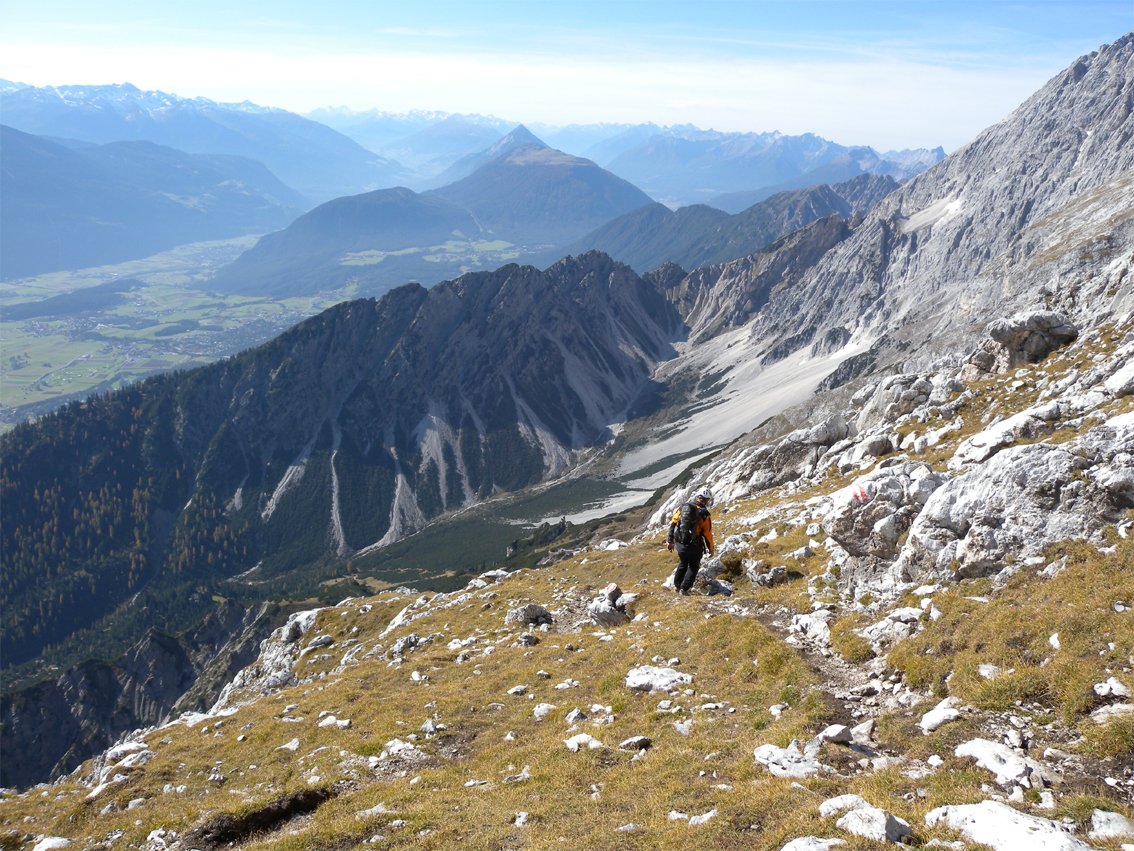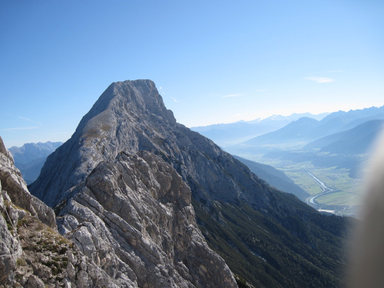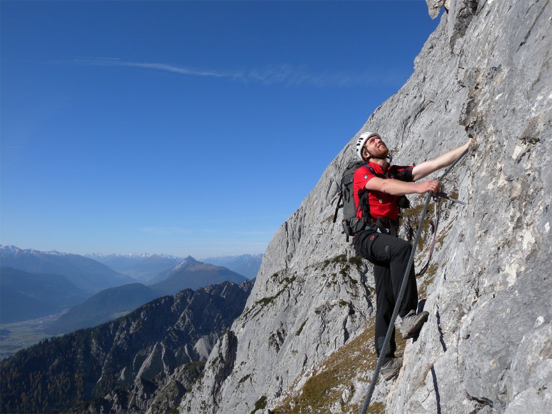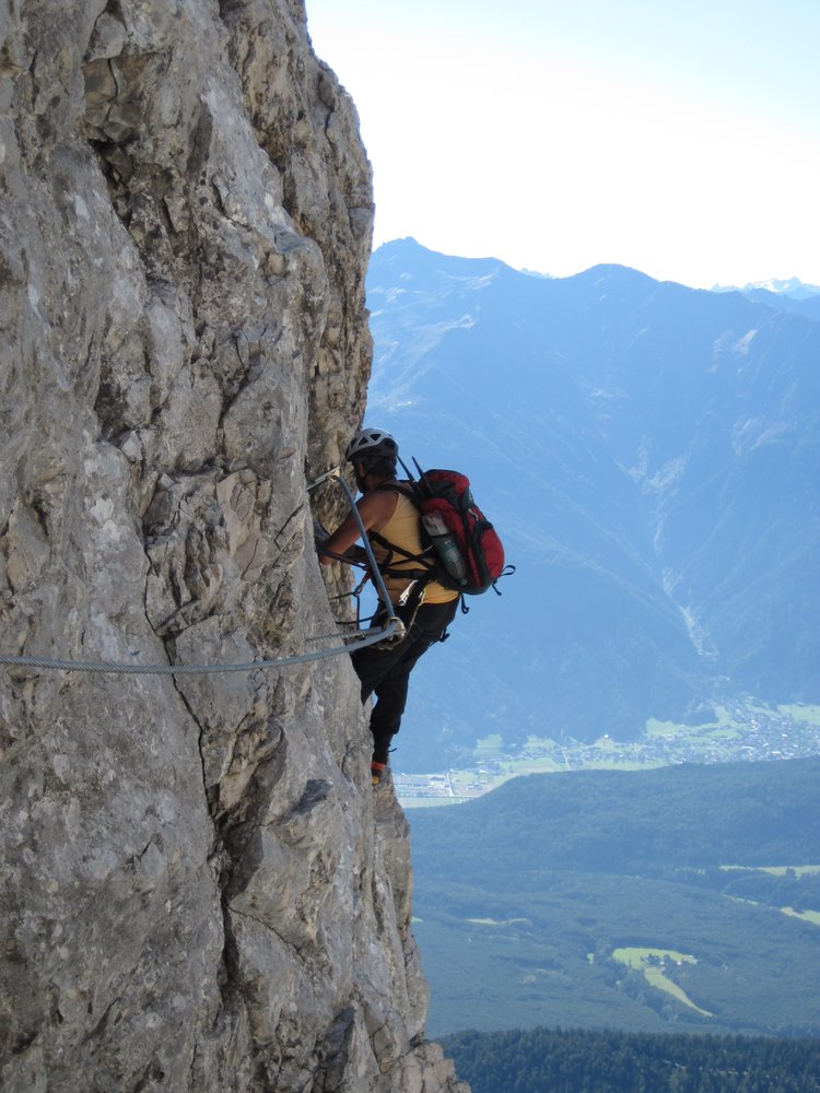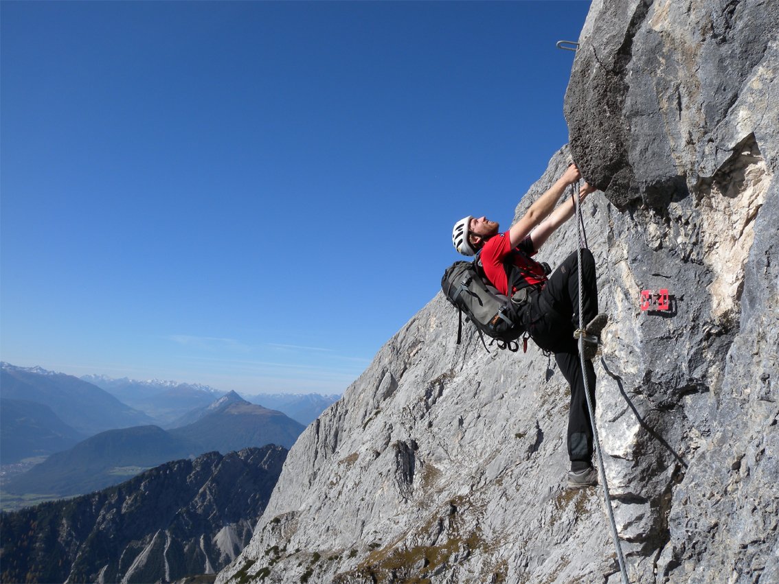 Schöner, langer Klettersteig auf den Karkopf. Der Klettersteig verläuft im Bereich des Ostgrates bzw. in den steilen Felswänden an dessen Südseite. Schwere und recht luftige Kletterpassagen halten mit leichten aber aussichtsreichen Gratpassagen die Waage und so erreicht man – im Blick immer das Inntal, die Hohe Munde und die Zugspitze – nach ca.2,5 Std. den Ausstieg. Die Erbauer haben recht originelle Passagen geschaffen, die Palette reicht von glatten Platten, steilen Pfeilern mit Klammern, Löchern (Adlerauge) bis hin zu luftigen Querungen. Ganz im Stil moderner Sportklettersteige wurde eine abwechslungsreiche Route geschaffen, die schon vor der geplanten Eröffnung im Oktober 2008 zahlreiche Ferratisten in ihren Bann zog.