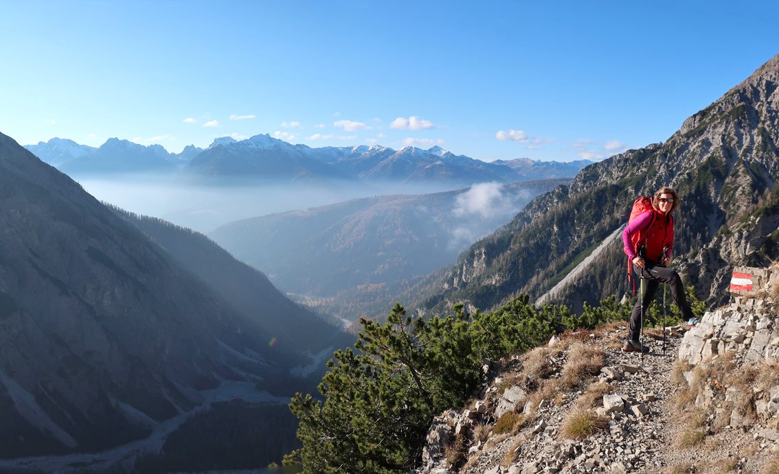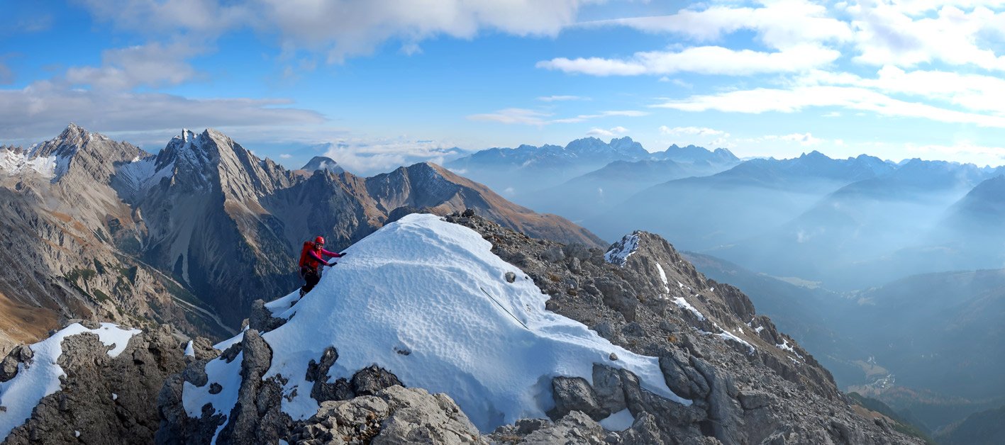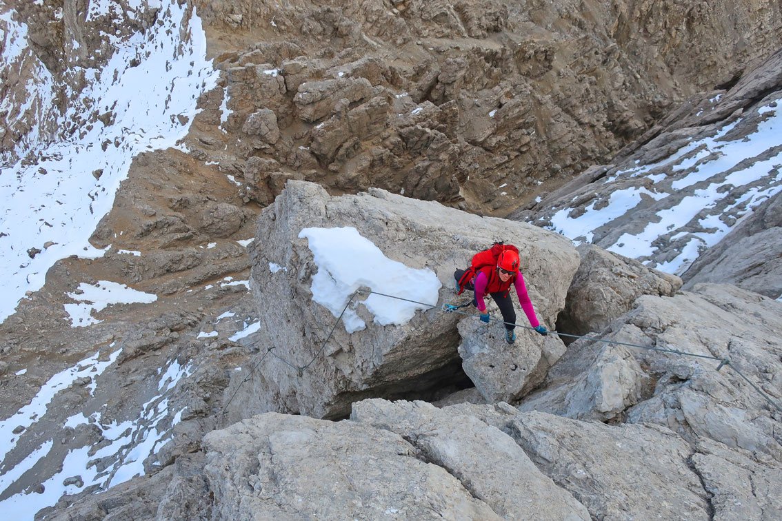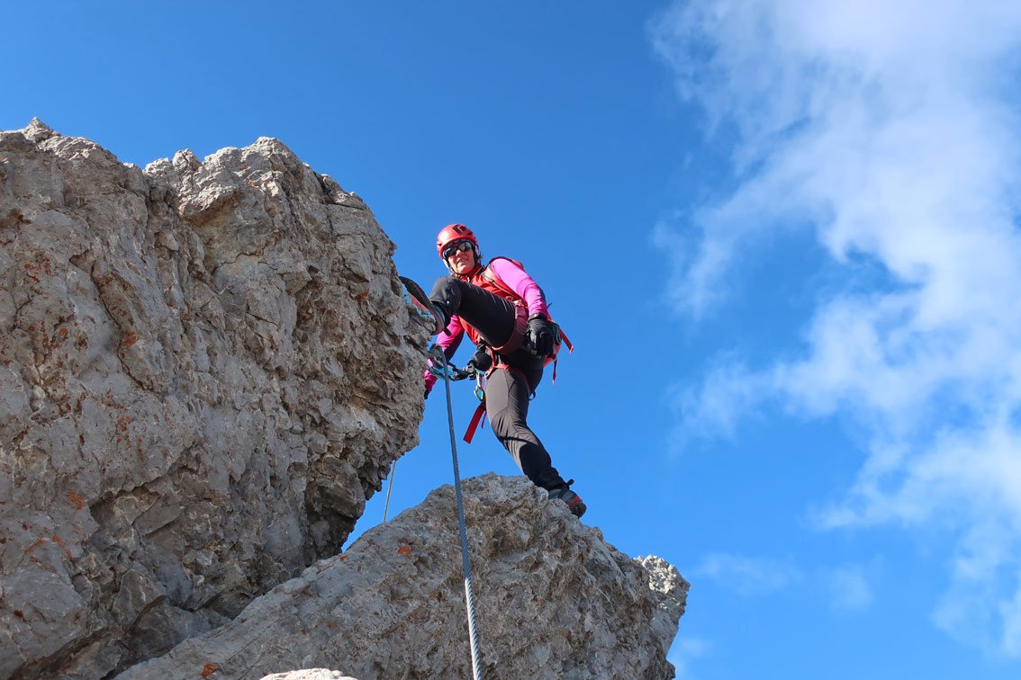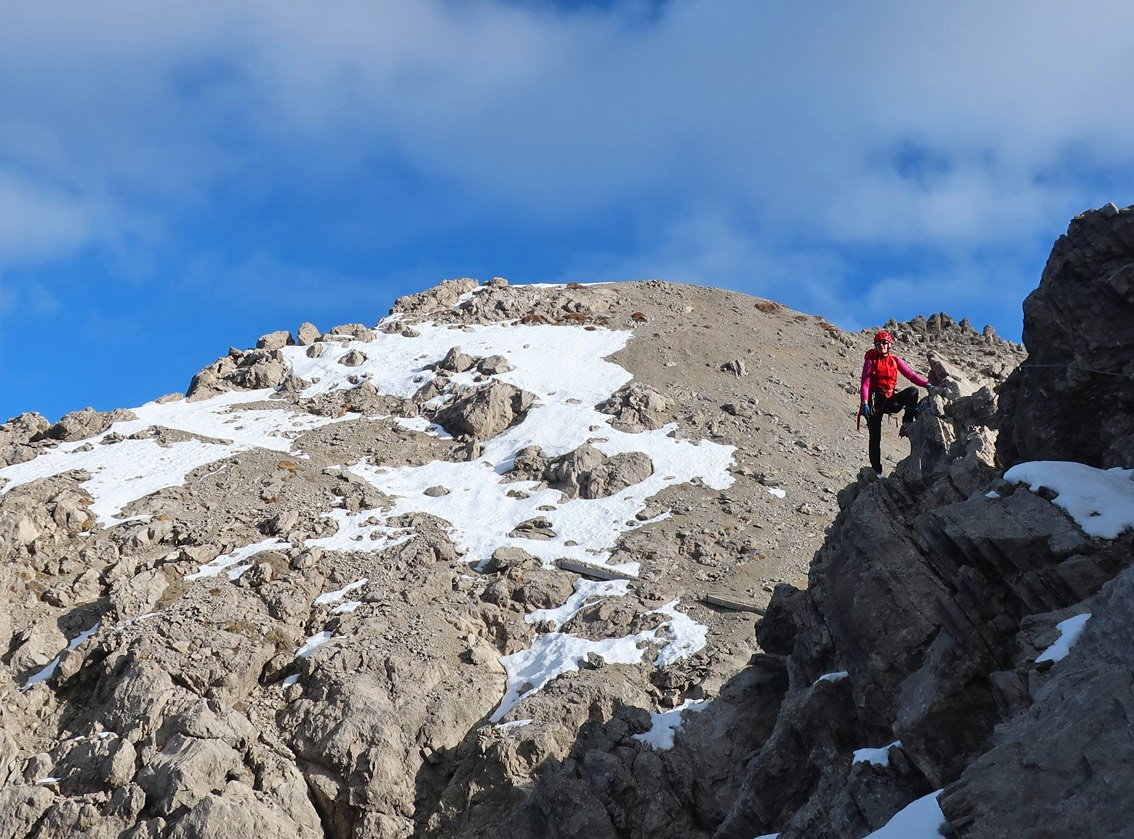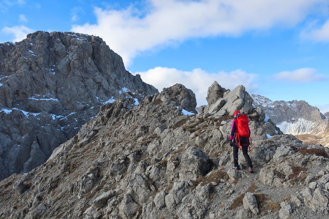 Es gibt ein paar ungesicherte Passagen, Trittsicherheit und Schwindelfreiheit und ein gewisses Maß an alpiner Erfahrung nötig. Vor allem in der Gipfelwand auf Steinschlag achten.