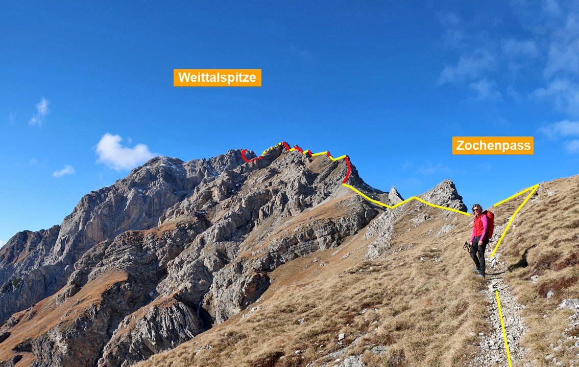 Schöner Klettersteig, welcher vom Zochenpass auf dem zackigen Ostgrat zum Gipfel der Weittalspitze führt. Der Klettersteig hat zwei Teile, im ersten sind bis zur Gipfelwand viele Gehpassagen und leichte Kletterstellen. Die Gipfelwand ist steil und an der Kante vor dem Klemmblock ausgesetzt. Insgesamt eine nicht sehr überlaufene Steiganlage, die man entweder von Tuffbad im Lesachtal oder von der Kerschbaumer-Alm aus machen kann.