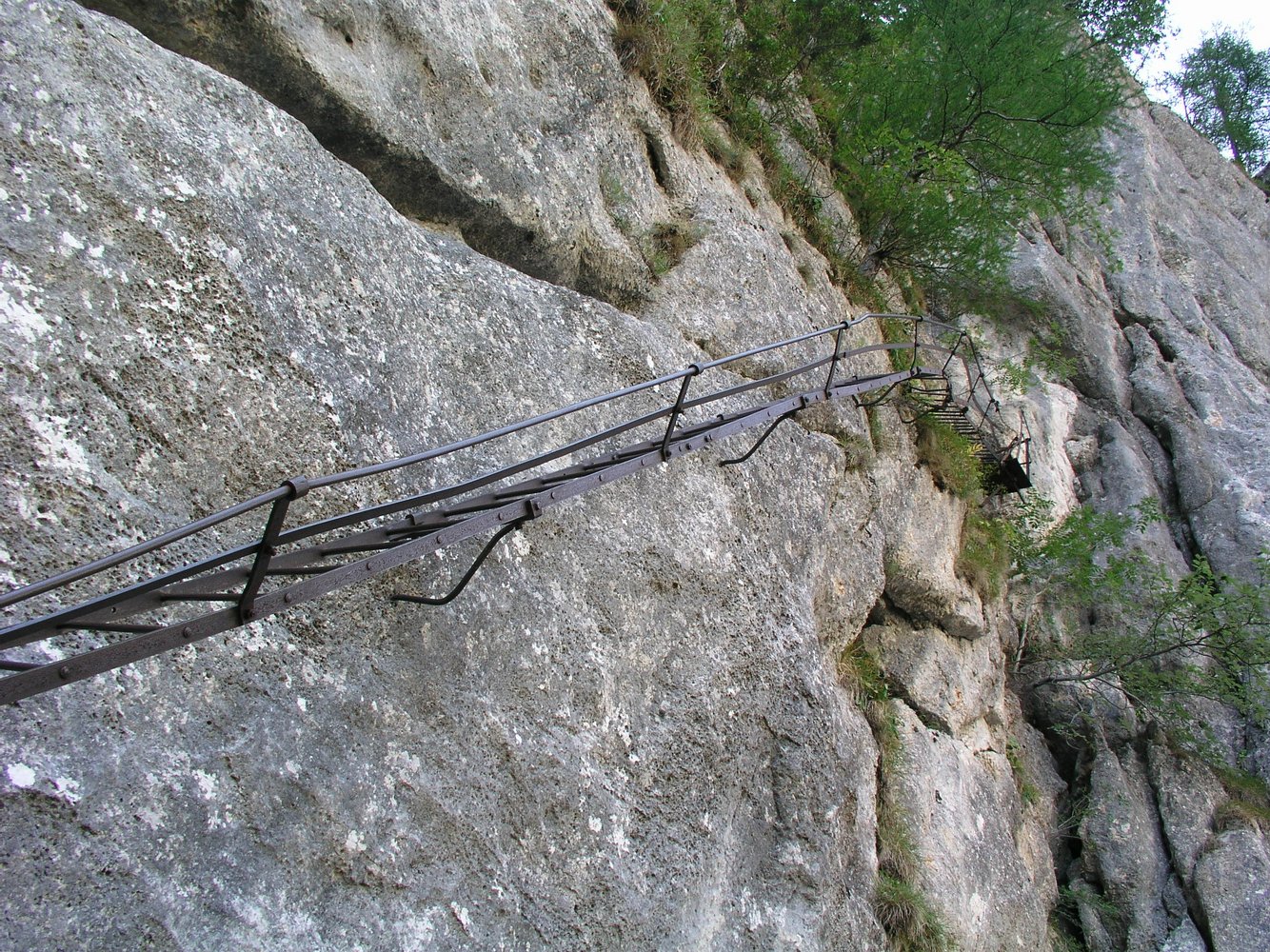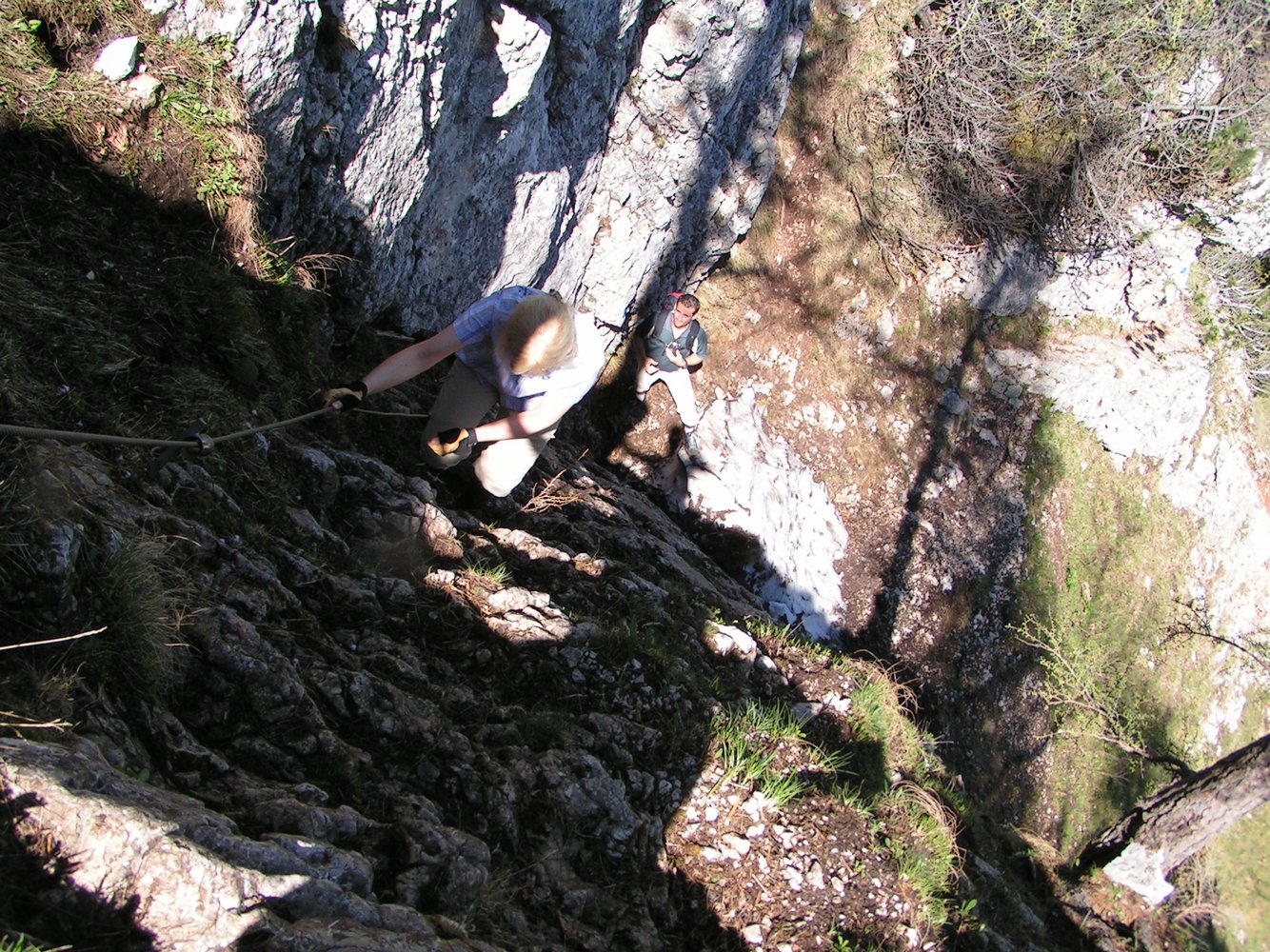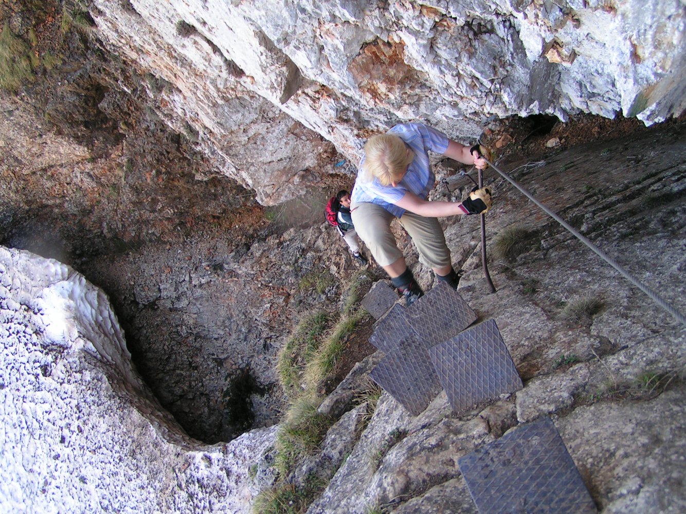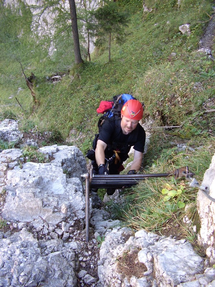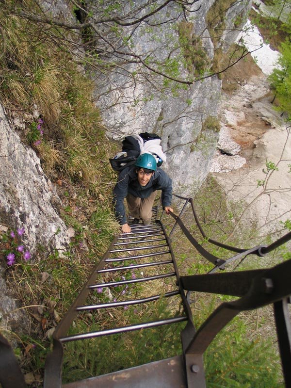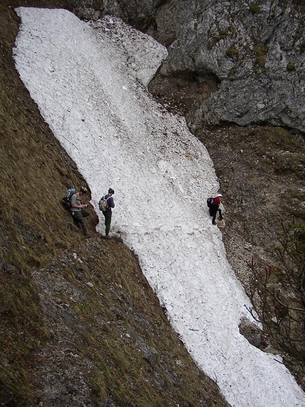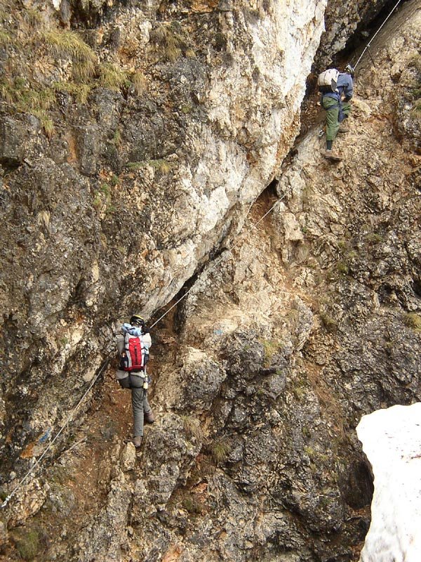 1. Im Frühjahr liegt in den Rinnen dieses nordwestseitigen Steiges oft noch sehr lange Schnee, von dem auch die Sicherungsseile bedeckt werden. Dieser Umstand führte zu vielen Bergrettungseinsätzen.