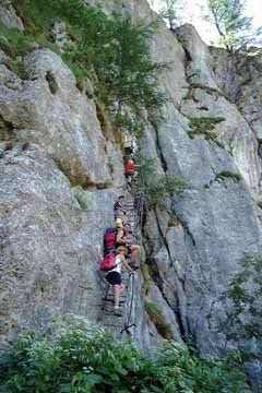 Trittsicherheit erforderlich! Nicht immer versichert. Die gesamte konditionelle Anforderung ist nicht zu unterschätzen. Für Kinder mit Ausdauer durchaus geeignet (Sicherungsseil/Klettersteigset und Helm nicht vergessen)!