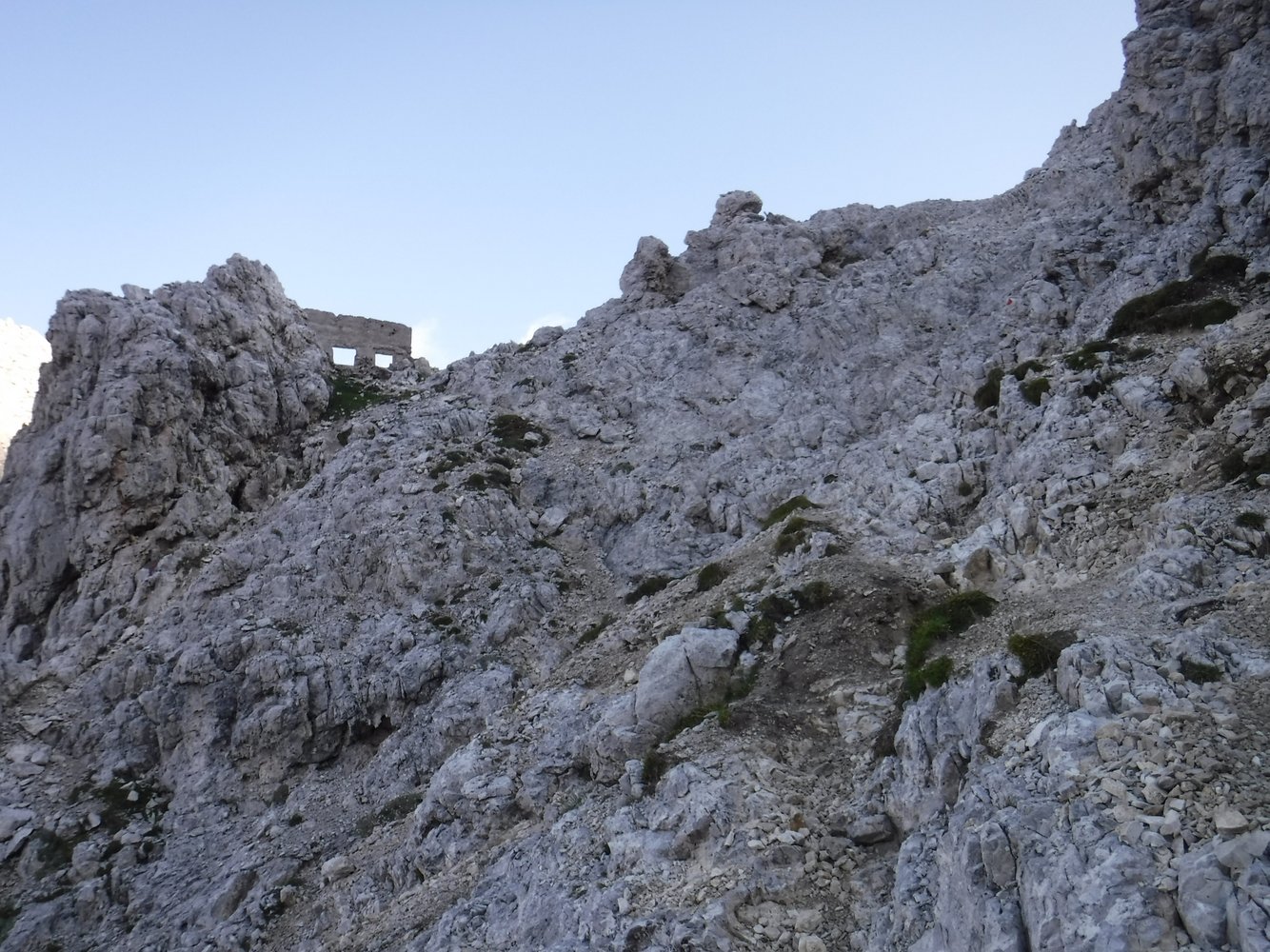Variante a2: Rotwandklettersteig – Sentinella Scharte: Den Rotwand Klettersteig (siehe dort) bis ca. 250 Hm vor den Gipfel aufsteigen, rechts zur Wegkreuzung auf 2675 m und zur Sentinellascharte (4 Std.).