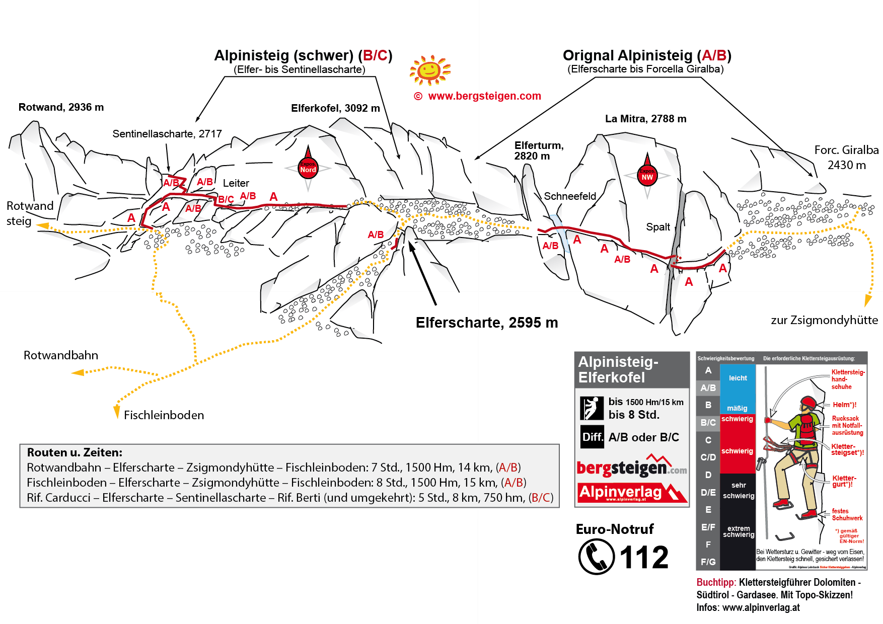a) Von der Bergstation der Rotwand-Kabinenbahn (dorthin auch auf dem Weg 124 durch das Rotwandtal) über die Rotwandwiesen zur Bergstation des Rotwandwiesen-Schlepplifts. Rechts in den Wald und zu einem kurzen versicherten Abschnitt (auf ca. 2140 m, A) aufsteigen. Beim folgenden Wegweiser rechts (Gamssteig, Weg 100) durch das Weitental und Andertertal bis zur Elferscharte, 2650 m. Dort einige Möglichkeiten: Leicht: Auf dem Weg 101 nicht zur Sentinellascharte links hinauf, sondern gerade weiter Richtung Carducci-/Zsigmondyhütte über eine Geröllrampe zu den Westabstürzen des Elferturms (Beginn der Versicherungen N46.63252 E12.37485). Um den Turm herum (A) ins oft schneegefüllte Äußere Loch zu den Bändern der La Mitra. Auf schmalen Bändern (A) zum Spalt und um die Mitra herum. Ende der Versicherungen (N46.62835 E12.37229). Weiter auf einem Weg über das Innere Loch zur Forc. Giralba, 2431 m, und wenige Hm davor rechts auf Weg 101 zum Rif. Zsigmondy und zurück zum Fischleinboden oder auf Weg 103 in die Scharte aufsteigen und auf der anderen Seite in 15 Min. zum Rif. Carducci hinunter. Variante